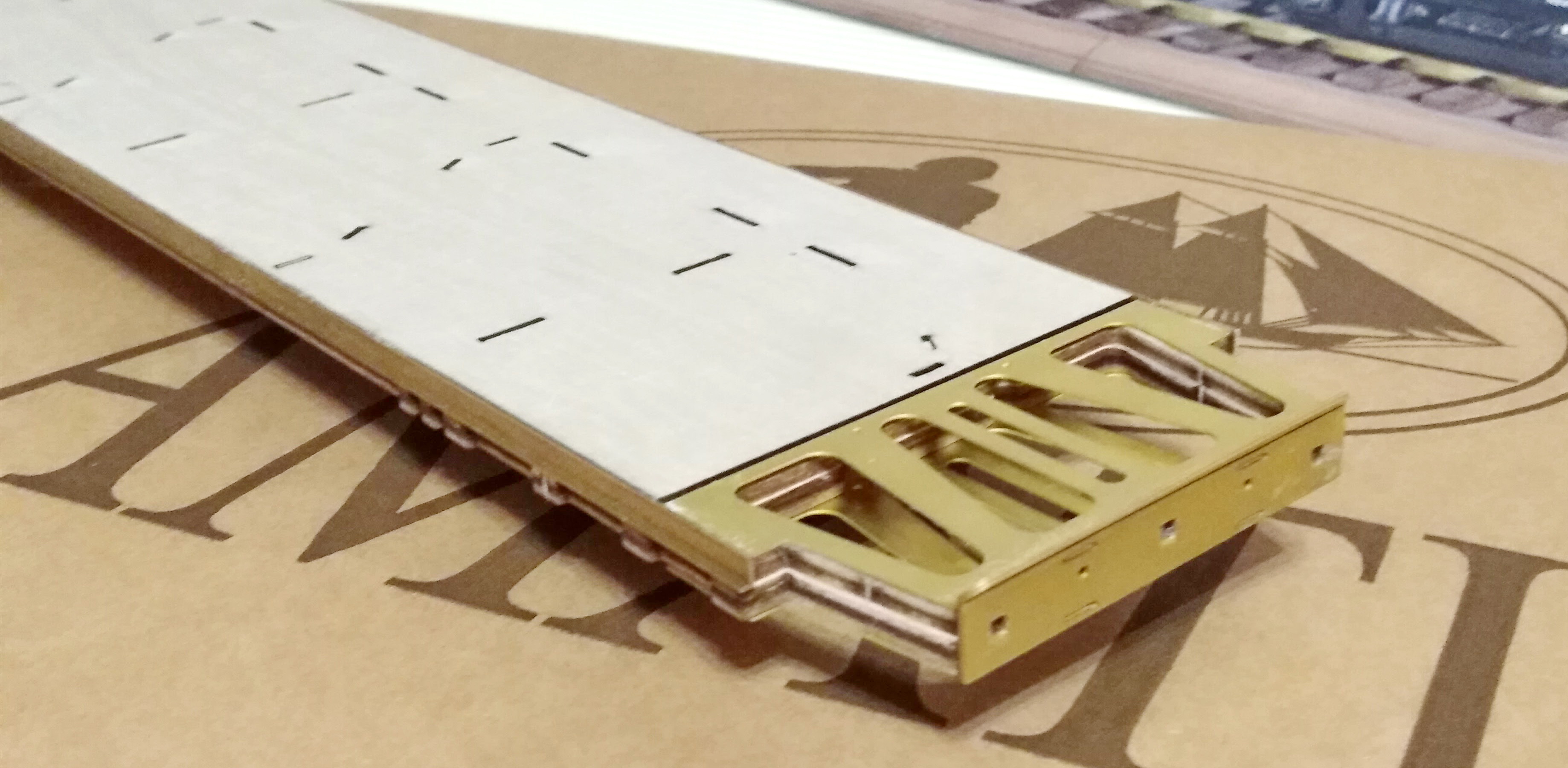 Очень приятно выглядит начало. Необычный "гибридный" кит, деревянный каркас и латунная обшивка, получается, что пайка не нужна здесь при креплении латунных деталей, очень интересно.... 8-)