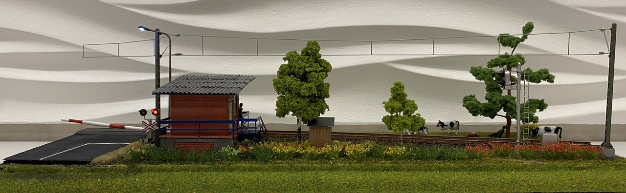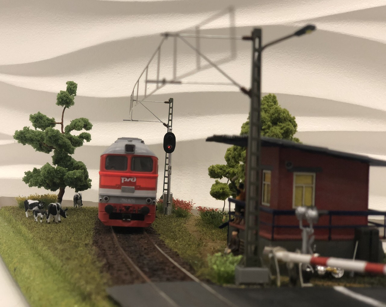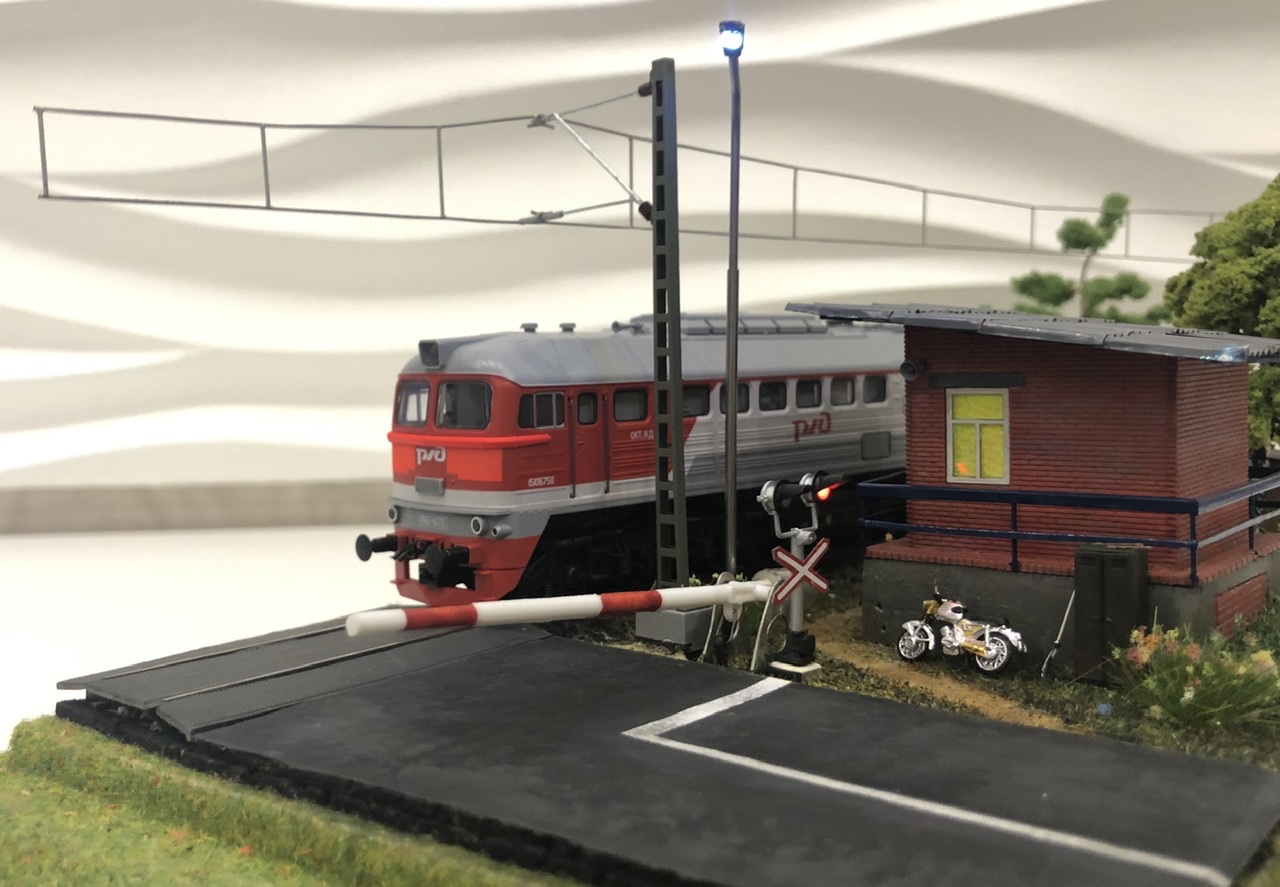 Двузначный светофор, шлагбаум и контактные провода со столбами купил на авито.