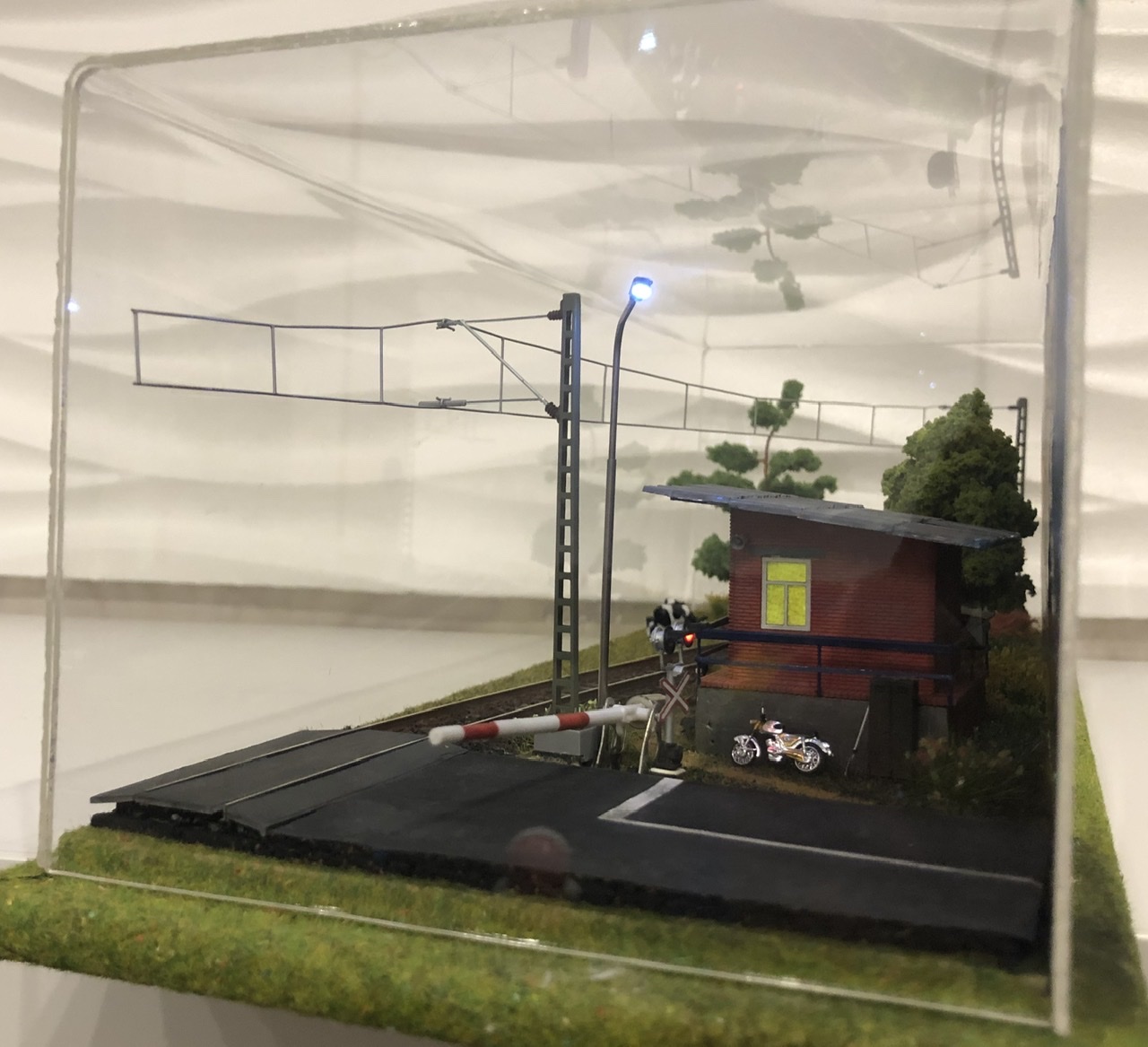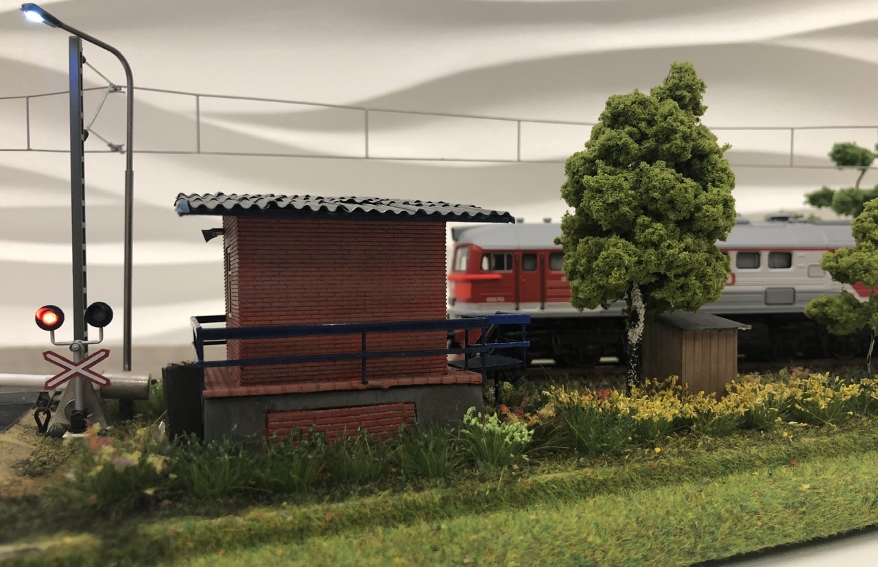 Управление светом осуществляется дип выключателем от двух 3 вольтовых батареек.. включается двузначный светофор (всегда красный), костер моргает, свет в туалете, будке дежурного, фонарь, а так же светофор на переезде тоже рабочий..