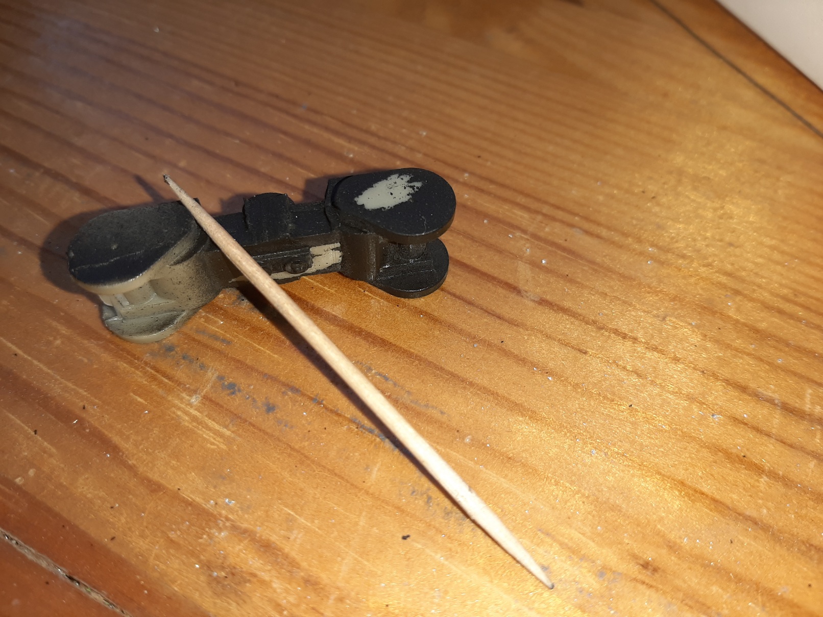 Нажаль, під час проведення невеличкого стрес тесту, виявилось, що фарба сходить з деталей разом з грунтовкою навіть при несильному впливі зубочистки. Деталі знежирювалися у воді з миючим засобом та бензином Калоша. Подальші роботи зупинено на час проведення розслідування та усунення причин та наслідків.