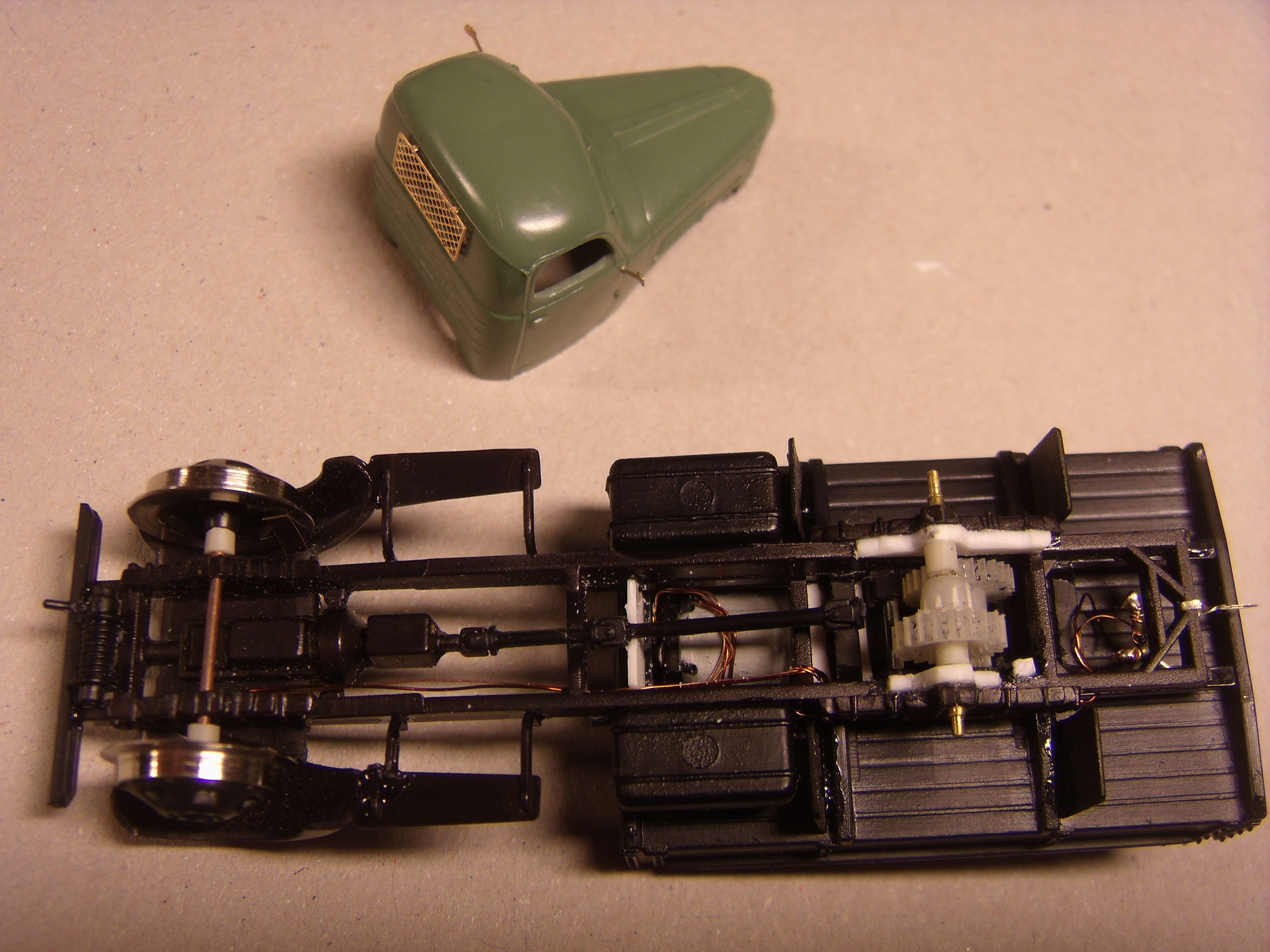 Проведена масса всяких эксперементов с двигательными характеристиками модели :ugeek: , - подбором приводящего механизма, токосъемом, трением на колёсах, общим весом аппаратика, развесовкой по осям, работа с неполярным конденсатором.