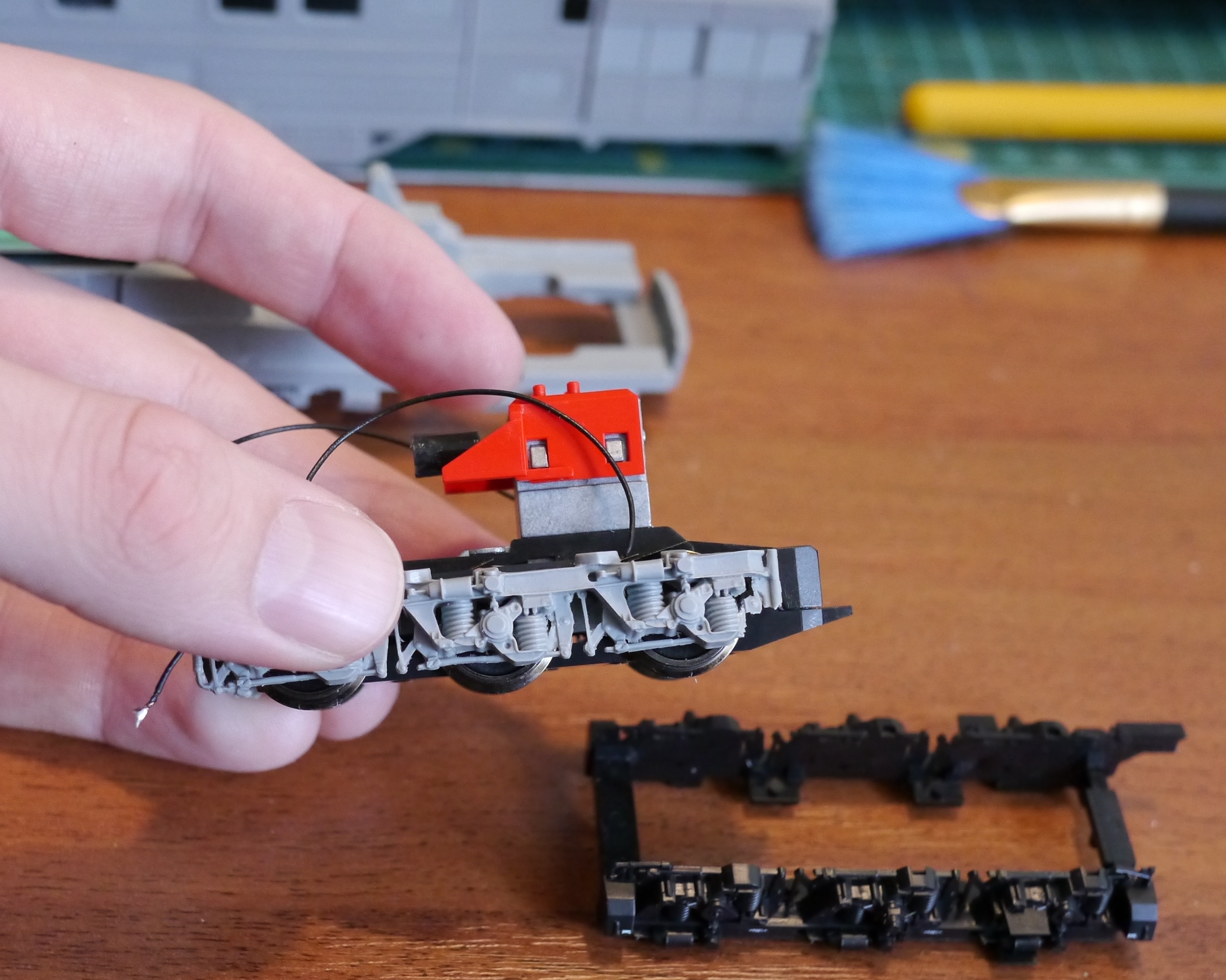 И после сборки натолкнулся на первый (и пока единственный) нюанс. Родной токосъем Roco активно скреб по раме, телеги толком не хотели проворачиваться. Мешали отлитые с рамой резервуары и кое-какие элементы самой рамы. Благо, что смола очень легкий в обработке материал. Надфилем решил этот вопрос.