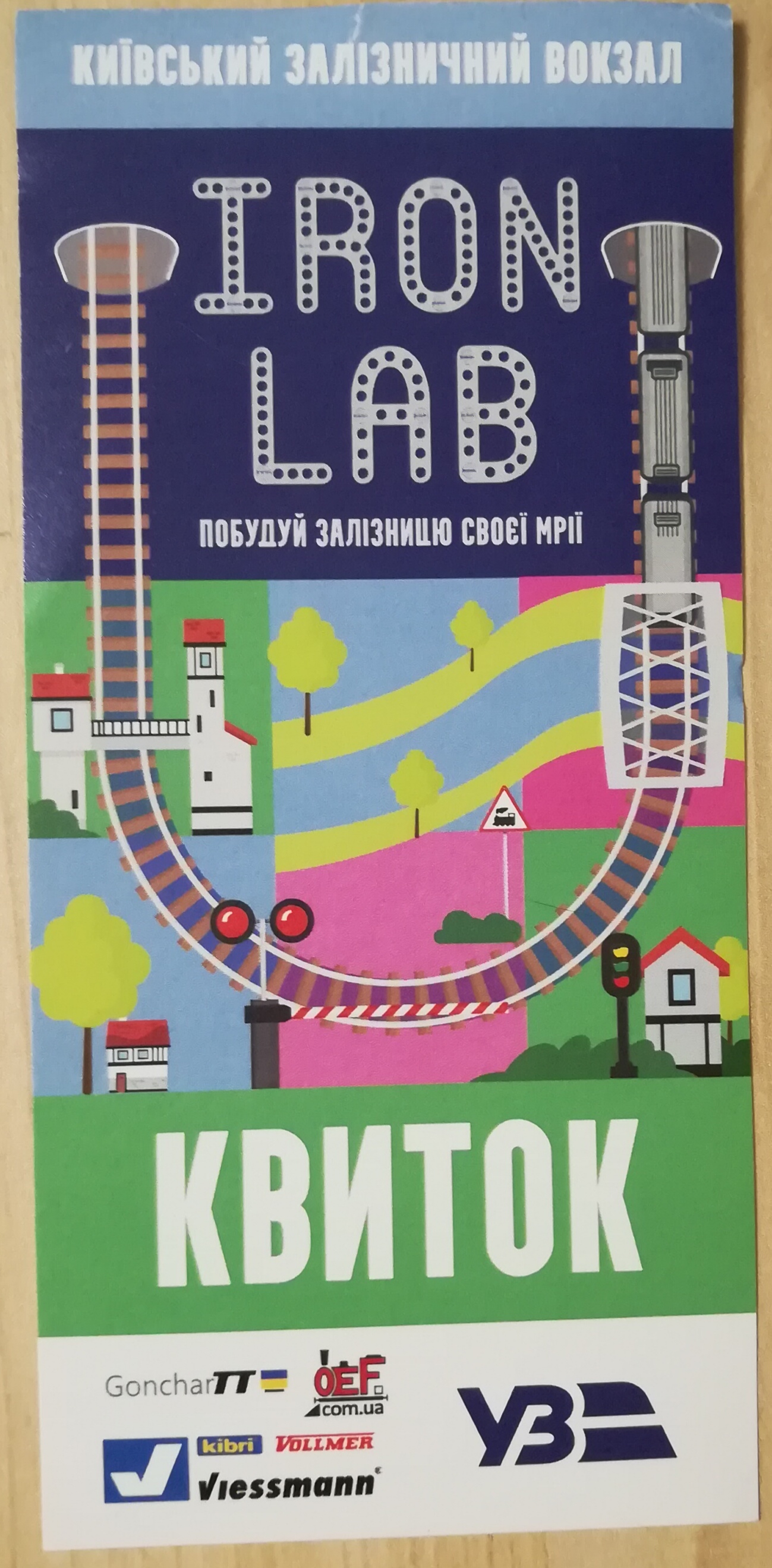 Так виглядав безкоштовний вхідний квиток на виставку. На іншій стороні діти отримували штамп після проходження чергової "станції" (зробити дерево, зібрати домік, покерувати потягом і т.д.). Зібрав всі штампи на зворотньому боці, надалі при пред'явлені цього квитка в касі Київської Детячої залізниці можна отримати безкоштовний проїзд на потязі ДЗД