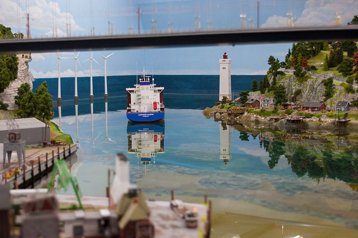 Представляю Скандинавский сегмент макета, а именно - Норвегия летом и Северная Швеция (если точнее, то Лапландия) зимой. Корабли в Норвегии, естественно, плавают по-настоящему, для этих целей они весьма хорошо технически оснащены, в том числе GPS -навигацией. Не знал, что она столь точно работает, чтоб корабль ориентировался во фьордах и обходил небольшие острова на макете, но информация про GPS - от экскурсовода, проводившего экскурсию "За кулисами" ( hinter den Kulissen) Miwula. Билет на данную экскурсию стоит несколько дороже, чем обычный, и экскурсии начинаются в фиксированное время, но всем, кто посещает музей не первый раз, а особенно тем, кто понимает по-немецки, я очень рекомендую ее купить: вы не только увидите, как все работает, куда улетают и откуда вылетают самолеты, как обслуживаются поезда, как и где подзаряжаются электроэнергией постоянно снующие тысячи автомобилей, но и услышите много интересного, но недоступного ни на сайте музея, ни при обычном его посещении. Экскурсоводы расскажут много прикольных историй, покажут некоторые интересные сценки, которые вы не заметили бы сами, расскажут интересные истории их создания. На экскурсии часто приходится наклоняться и пролезать именно за кулисами макета, вдоль километровых жгутов кабелей и рабочих электронных схем. Короче, красота, да и только