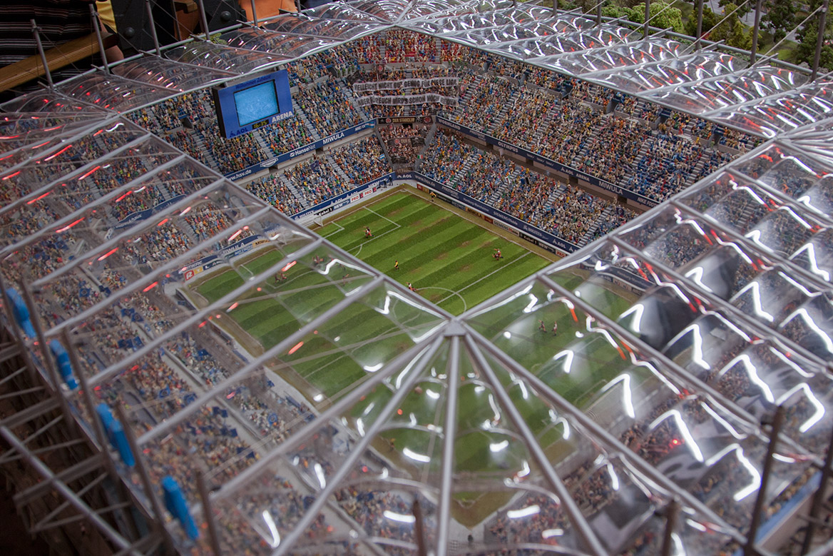 А это уже Гамбург, стадион AOL (America on line?) Arena, где происходит местное дерби - футбольный матч между командами HSV Hamburg и FC St. Pauli. Стадион ревет, болельщики на трибунах даже запускают "волну" ( при нажатии соответствующей кнопочки на бортике), но счет на табло неизменно в пользу HSV, St. Pauli здесь не выиграет никогда. В чем причина? Все очень просто, макет стадиона делали люди, болеющие за HSV, как мне объяснили во время экскурсии "за кулисами".