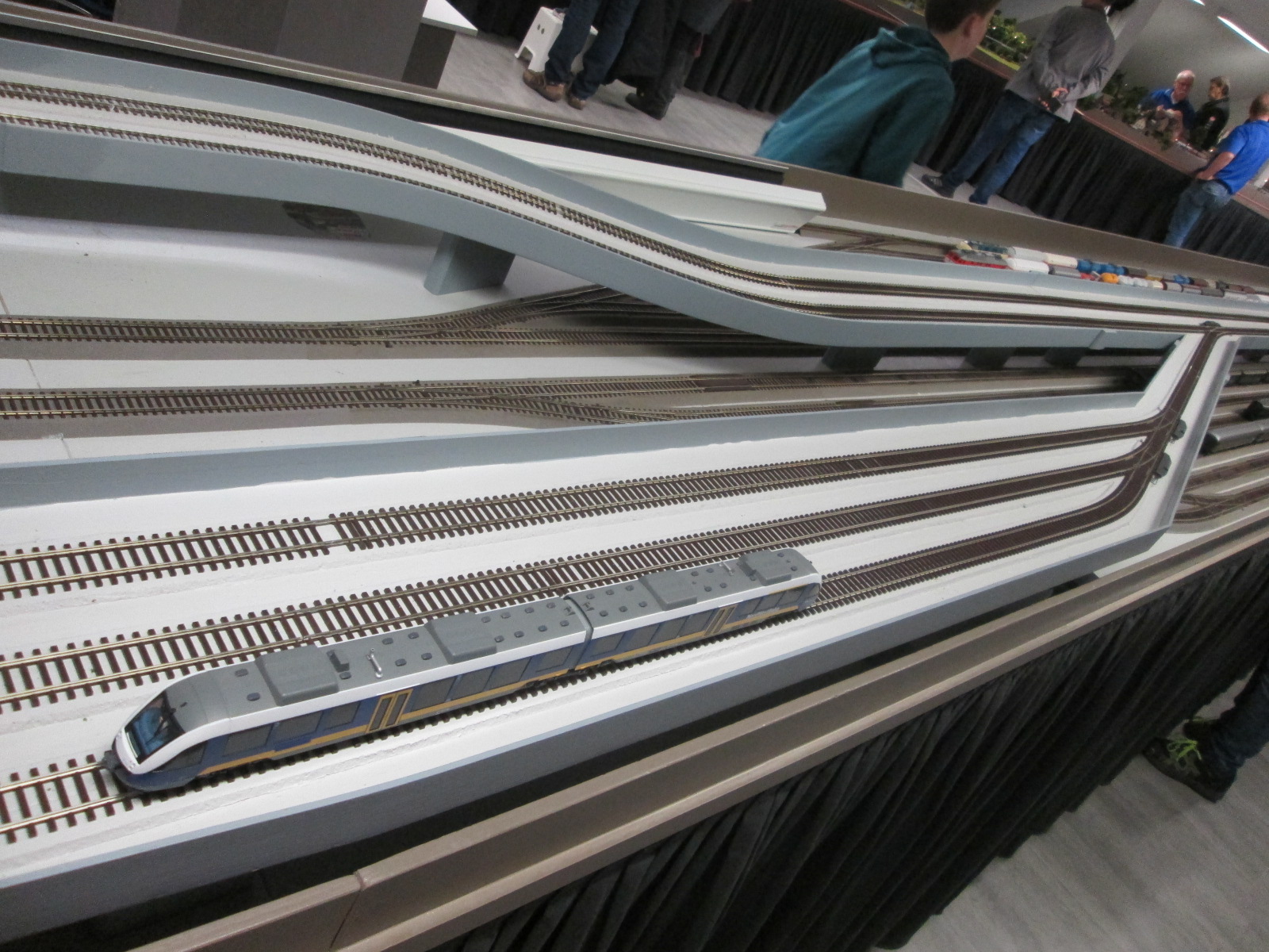 На первом этаже был модульный макет гостей из Мюнстера. Ихний макет был протяженностью около 50 метров. Количество поездов составляло 30 штук. Я не стал много фотографировать, боясь что не хватит заряда камеры на самое главное. Поэтому выкладываю всего немного фотографий этого макета с самыми интересными эпизодами. Длина путей составляет 175 метров. Весь макет иллюстрирует места земли Мюнстера.