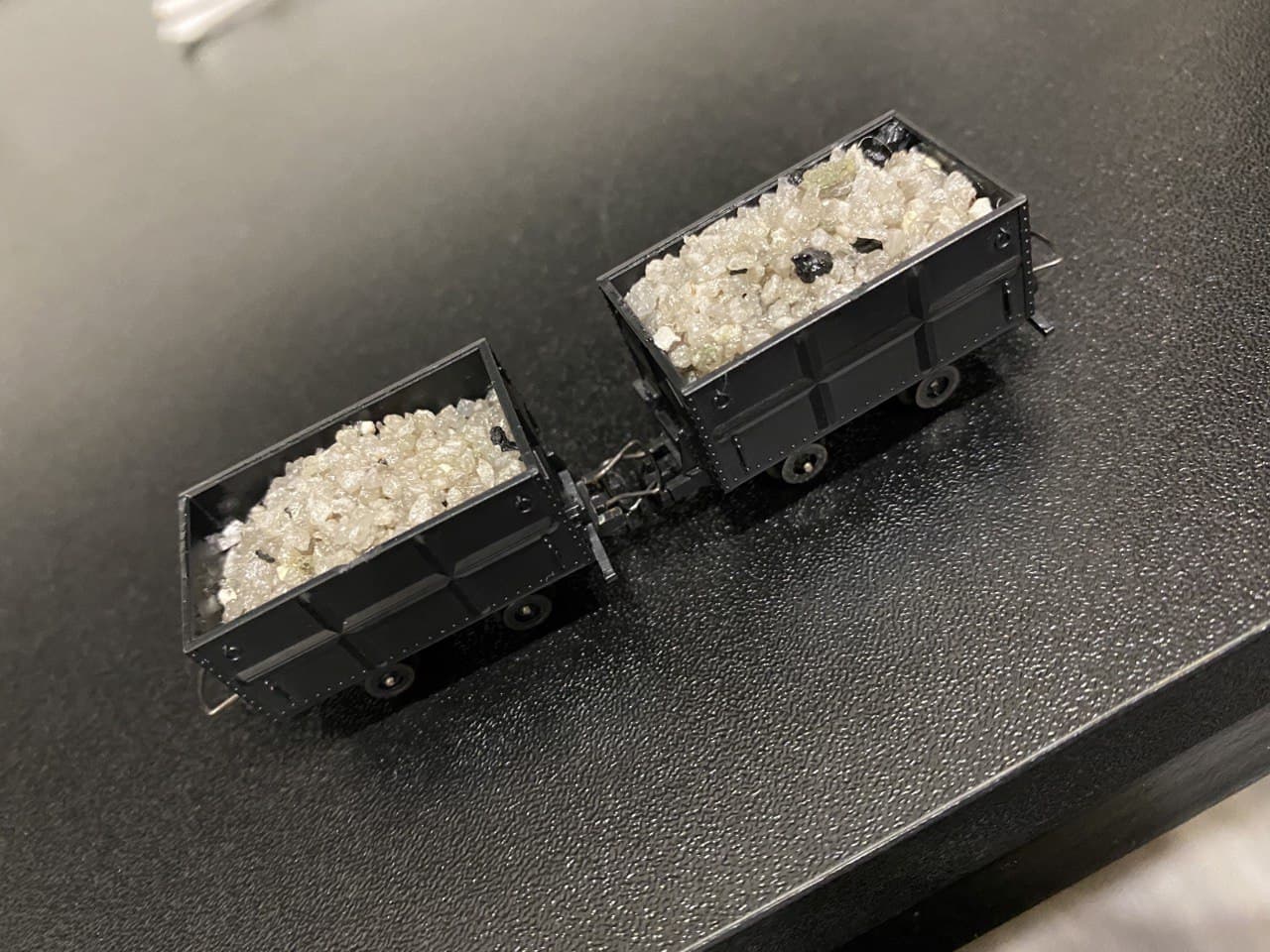 Вагонетки наполнял мелким гравием и заливал модельным клеем, не с целью эстетики а ввиду потребности в утяжелении этих вагонеток, весят то они копейки, длинный состав на радиусах просто сходил с рельс.