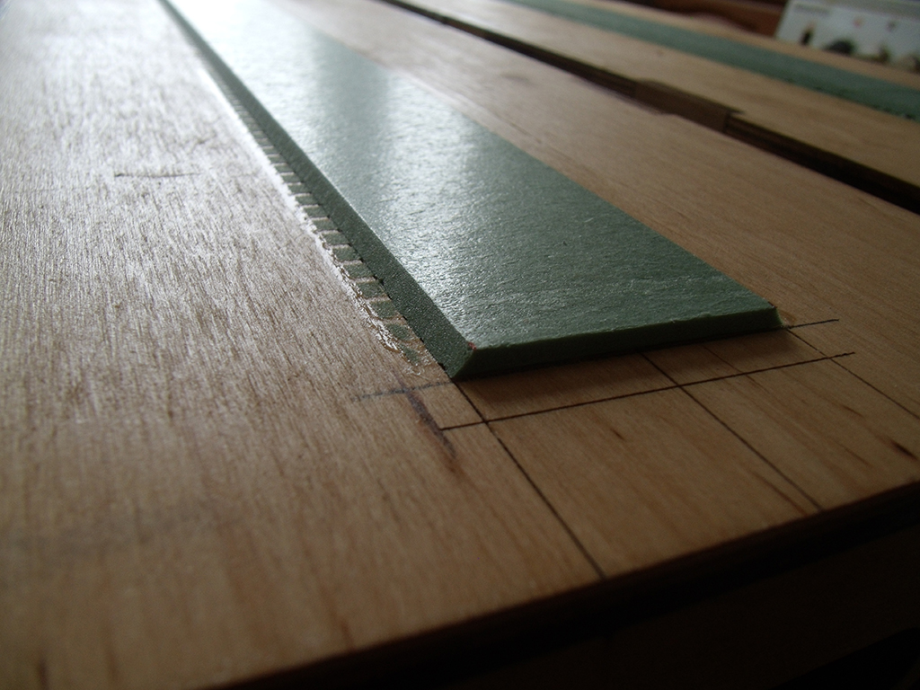Еще летом сделал себе заготовки модулей. Теперь зимними вечерами можно попробовать довести их до ума. Для начала наклеил 3 мм подложку от ламината. Сразу попробовал сформировать призму путем подрезки подложки под углом. На торце оставил место под вставки от путевого Като: они упростят позиционирование модулей при сборке. Такие вставки сделал просто распилив 62 мм участки пополам. Штатный рельс вынут и вместо него запущен рельс флекса. Он пока выступает, точная подгонка будет после. Примерка рельсов. Флексы изначально были разрезаны в центре модуля для формирования блок-участков, установлены изостыки. Осталось паять отводы для питания, сверлить крышку и укладывать путь с дальнейшей фиксацией термоклеем.