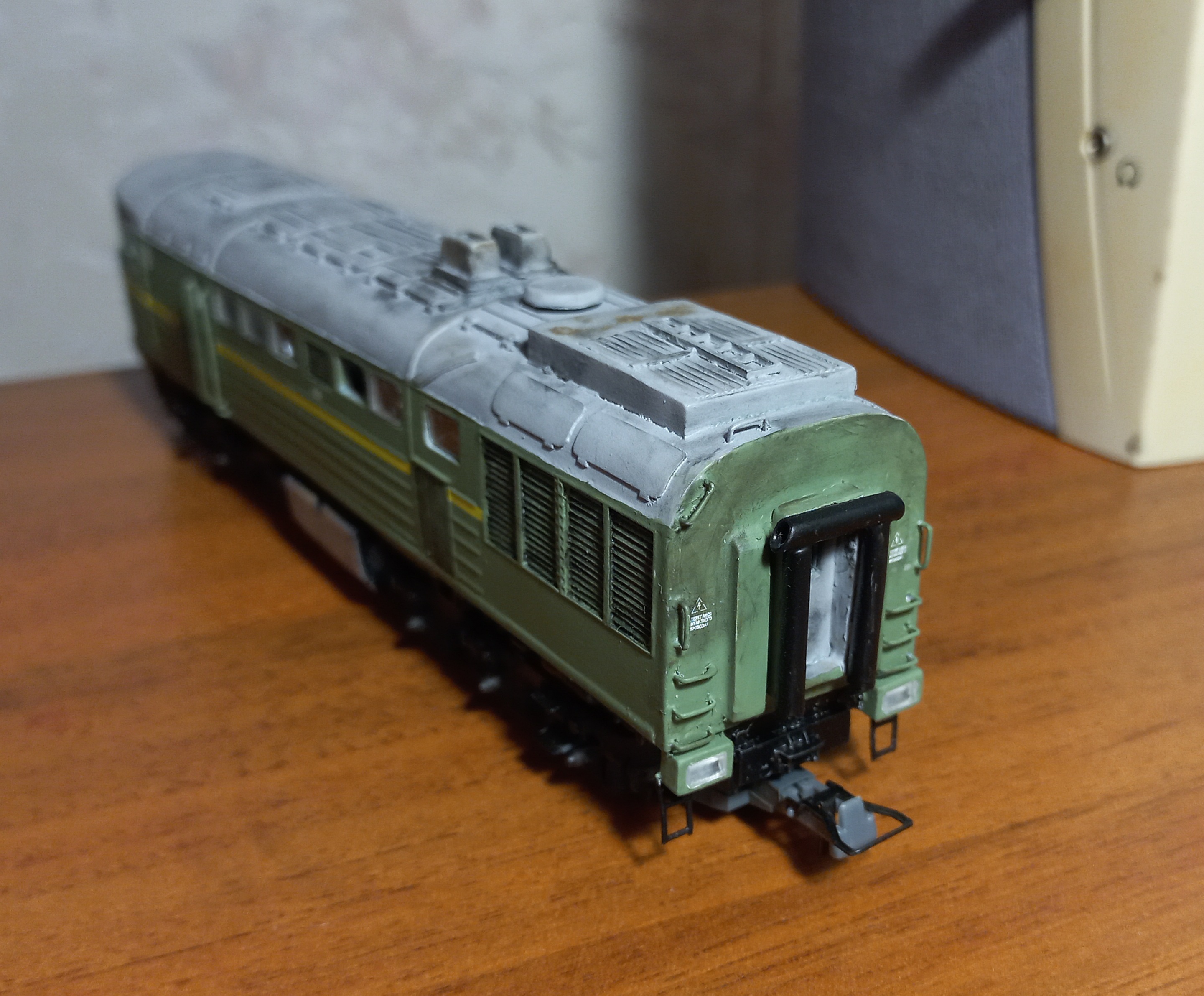 Фотка к сожалению не ахти, но немного есть в теме выше :roll: . Это многострадальная модель, сделал еще еще в 2014-м, затем поменял на паровоз Юре, через пару лет забрал назад. Ранние работы не лакировал, и как оказалось, с акриловой "Тамией" это большая ошибка. Пальцы, смазка, жидкость с дымогенератора - все это приводит к тому, что краска частично обтирается, местами становится похожа на резину - мягкая, и легко облазит, если поддеть ногтем. При больших плюсах акрила есть не меньшие минусы. Так же при первой сборке модели ничего не делал на "корме" (ни трапы, ни декали) - видимо, решил, что при сцепленных двух секциях все равно ничего не видно. Короче говоря, вопрос переделки назрел.