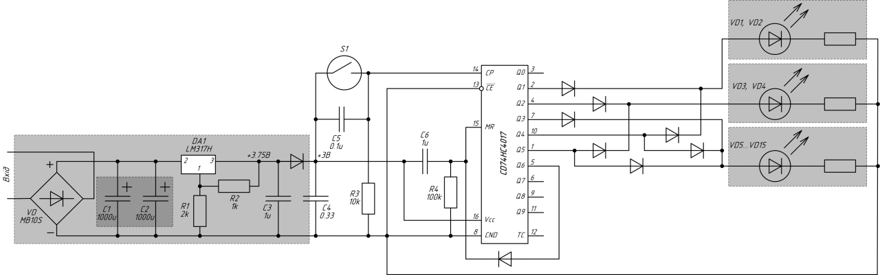 Ошибки в схеме не обнаружил4887 писав:...Схема хороша, но нижние цветные светодиоды нужно развернуть (сменить полярность), а то не будут светиться...