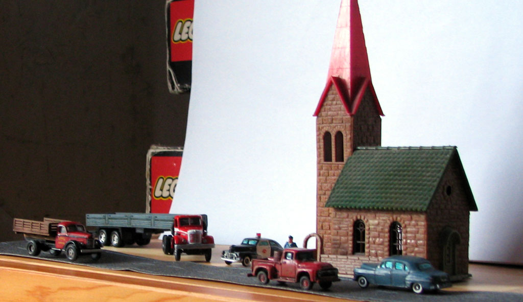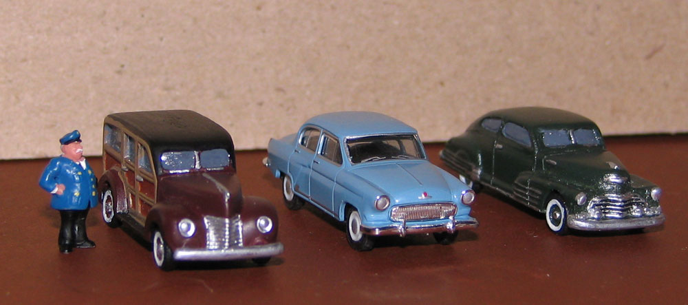 "На переезде". Перед шлагбаумом стоят DeSoto и пикап Ford, рядом с путями грузовик Autocar (чью роль исполняет ЗиС-5 от "Звезды" в масштабе 1:100). Нарушения масштаба тут практически нет, потому что Autocar выпускал и более крупную модель Ranger.
