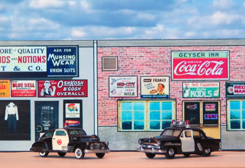 "Где-то в Америке на шоссе". Грузовики Federal и International, по шоссе едут DeSoto 1949 года и пикап Ford F100 1956 года, у обочины стоит полицейский Chevrolet 1947 года.