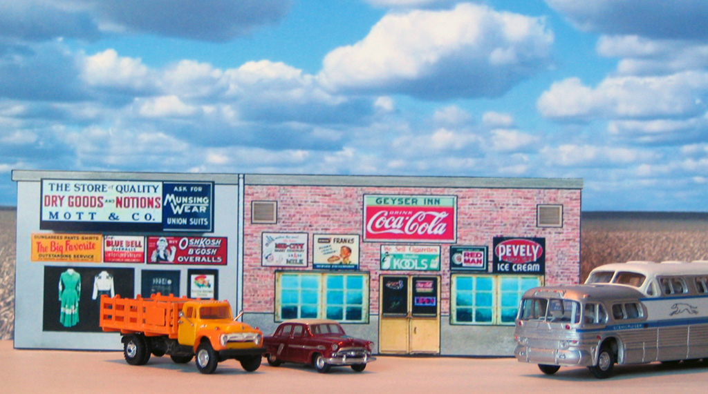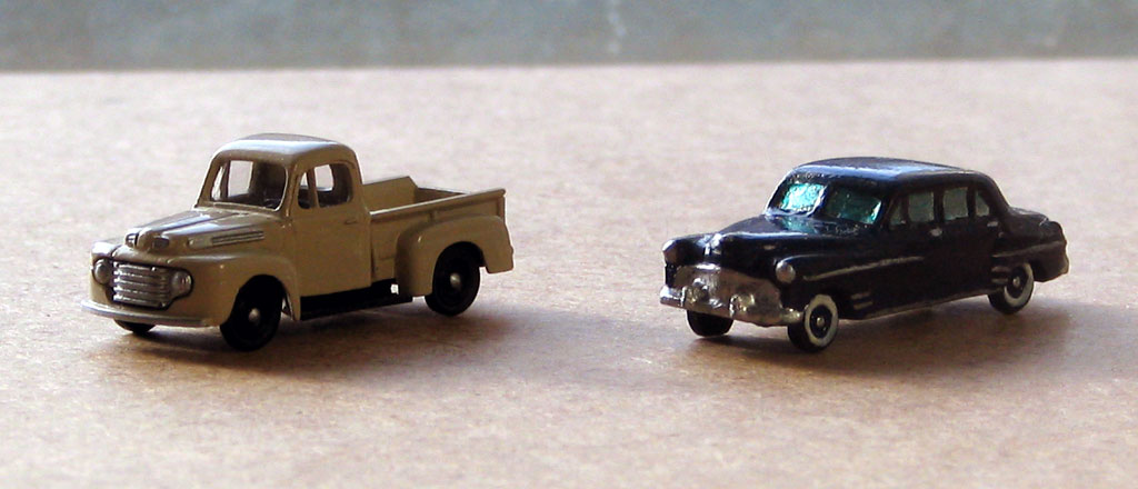 "На переезде". Перед шлагбаумом стоят DeSoto и пикап Ford, рядом с путями грузовик Autocar (чью роль исполняет ЗиС-5 от "Звезды" в масштабе 1:100). Нарушения масштаба тут практически нет, потому что Autocar выпускал и более крупную модель Ranger.