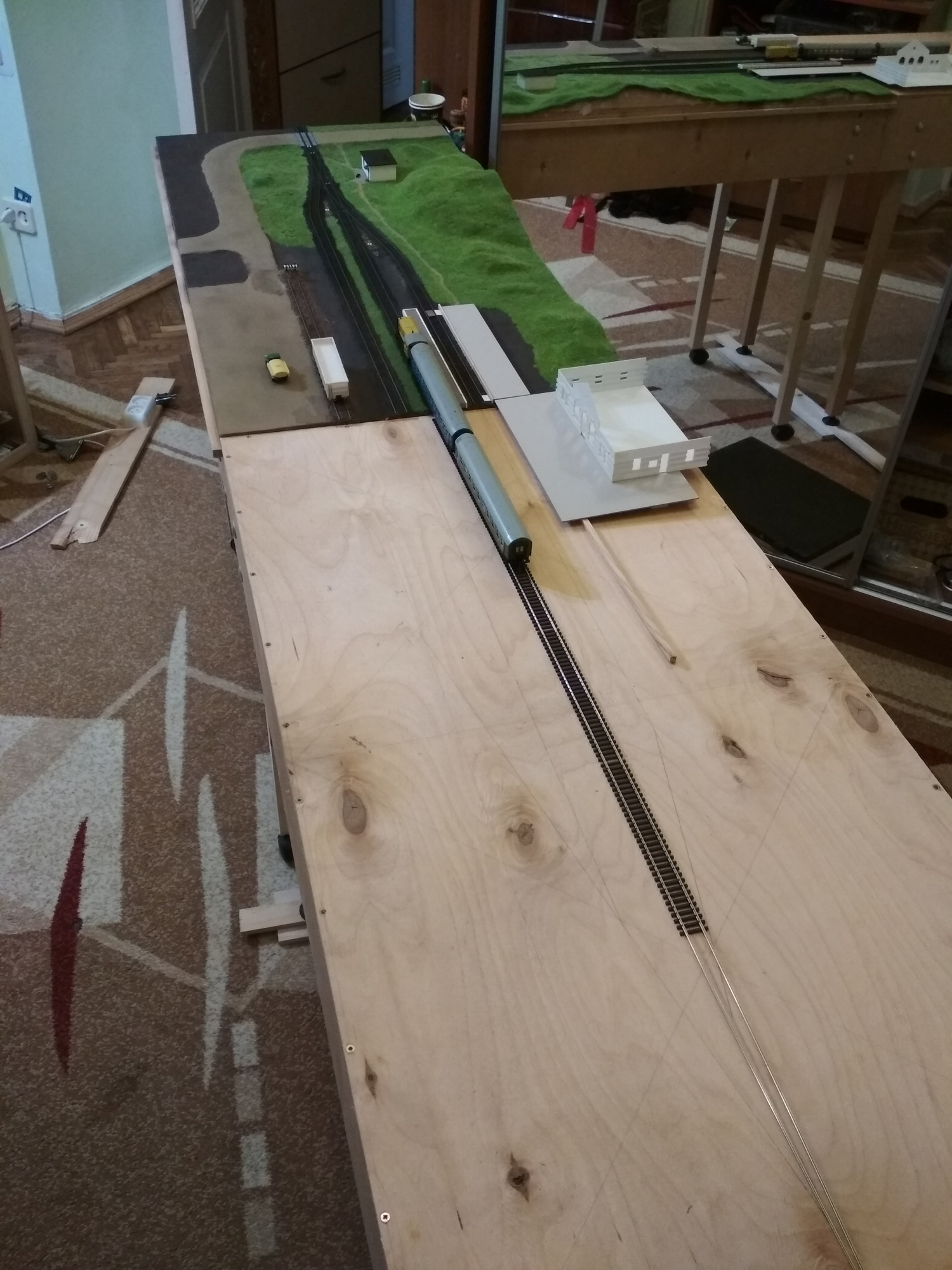 А вчора зрозумів, що пора розширятись, щоб місити хоча б маневри. Модуль скручений давно, ще порізана фанера на поворотні і прямі чекає свої черги в шафі. Тому зістикував оба модулі докупи і, поки жона Катя в святковому настрої після Катерини і передсвятковому до Миколая