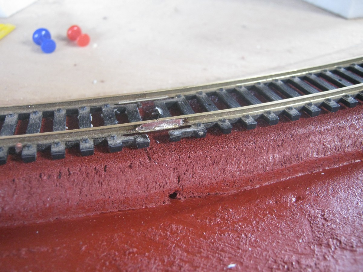 Пропаиваю только с внешней стороны, чтобы не влазить во внутренний габарит, хотя припой у меня затекает так, что никаких выступов нет. Радиусные рельсы Atlas и Tyco имеют несколько неудобные радиусы 18" и 22". 22" в моём случае нашли применение, а из 18"(457,2мм) сделал R2 421,9 мм по стандарту New Piko. Частично разрезал шпальную решётку и слегка подогнул.