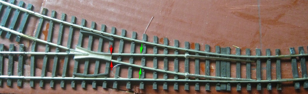 Вот одна из этих стрелок. Крестовина и остряки связаны в одну цепь и изолированы от остального пути. Предназначены для подключения с переключением полярности на крестовине, что безусловно способствует уверенному проходу локомотивов с короткой базой, вроде того-же стартового BR80.