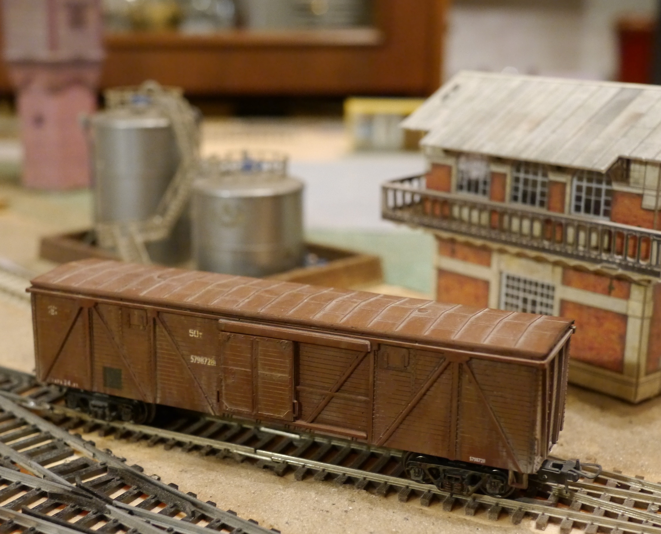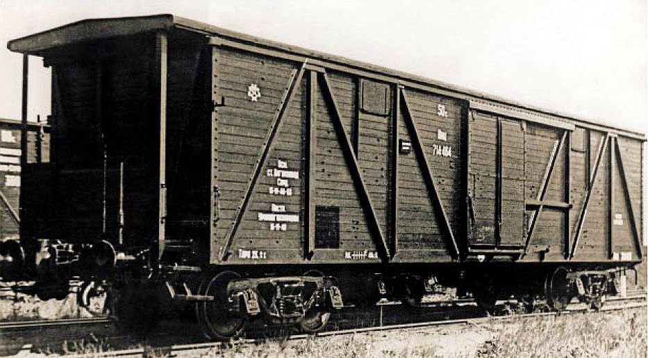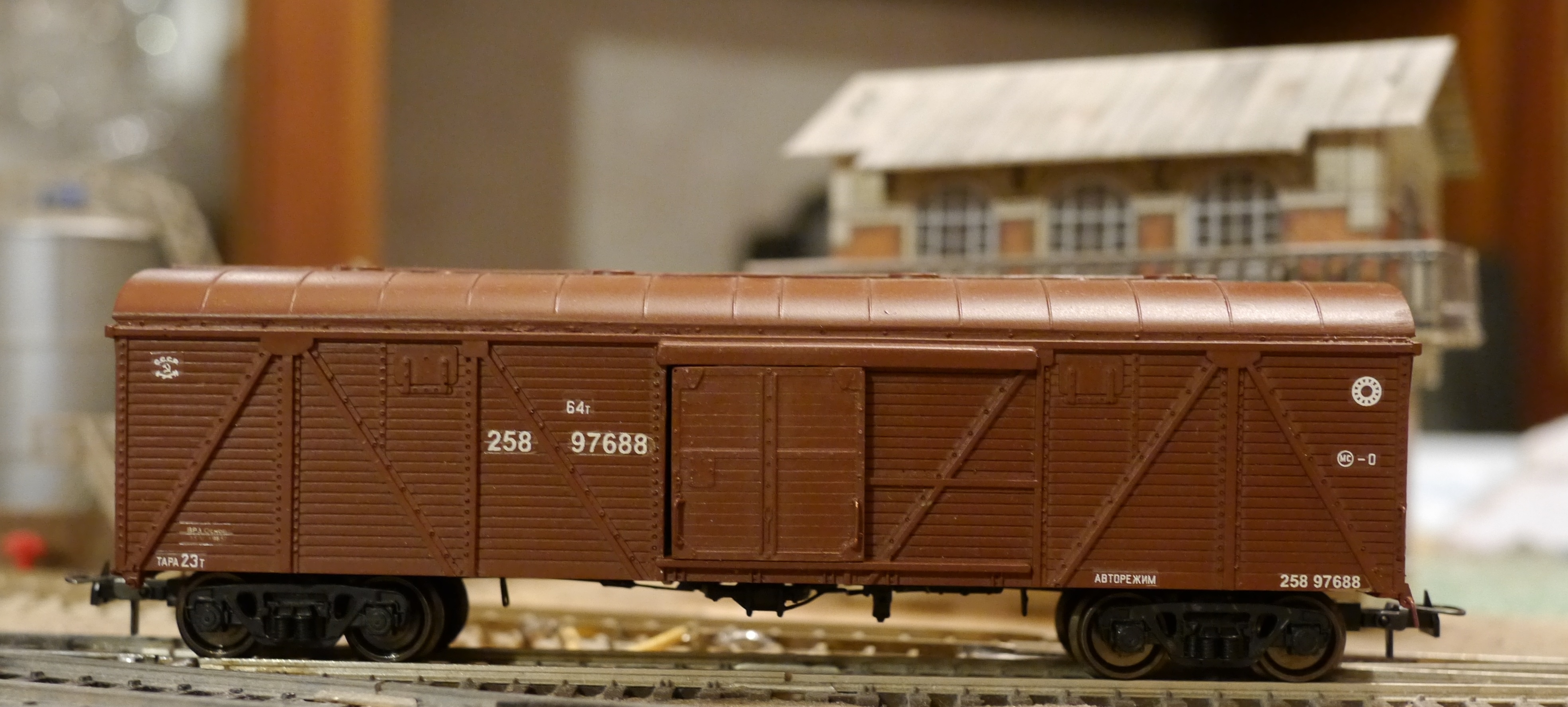 Прототип - очень распространенный на СЖД крытый вагон грузоподъемностью 50 тонн. Если смотреть старые фотографии грузовых поездов, почти наверняка вы его там увидите. Бывали как с тормозной площадкой, так и без нее. Моя модель как раз без площадки, но довольно симпатично сделан "загадинг".