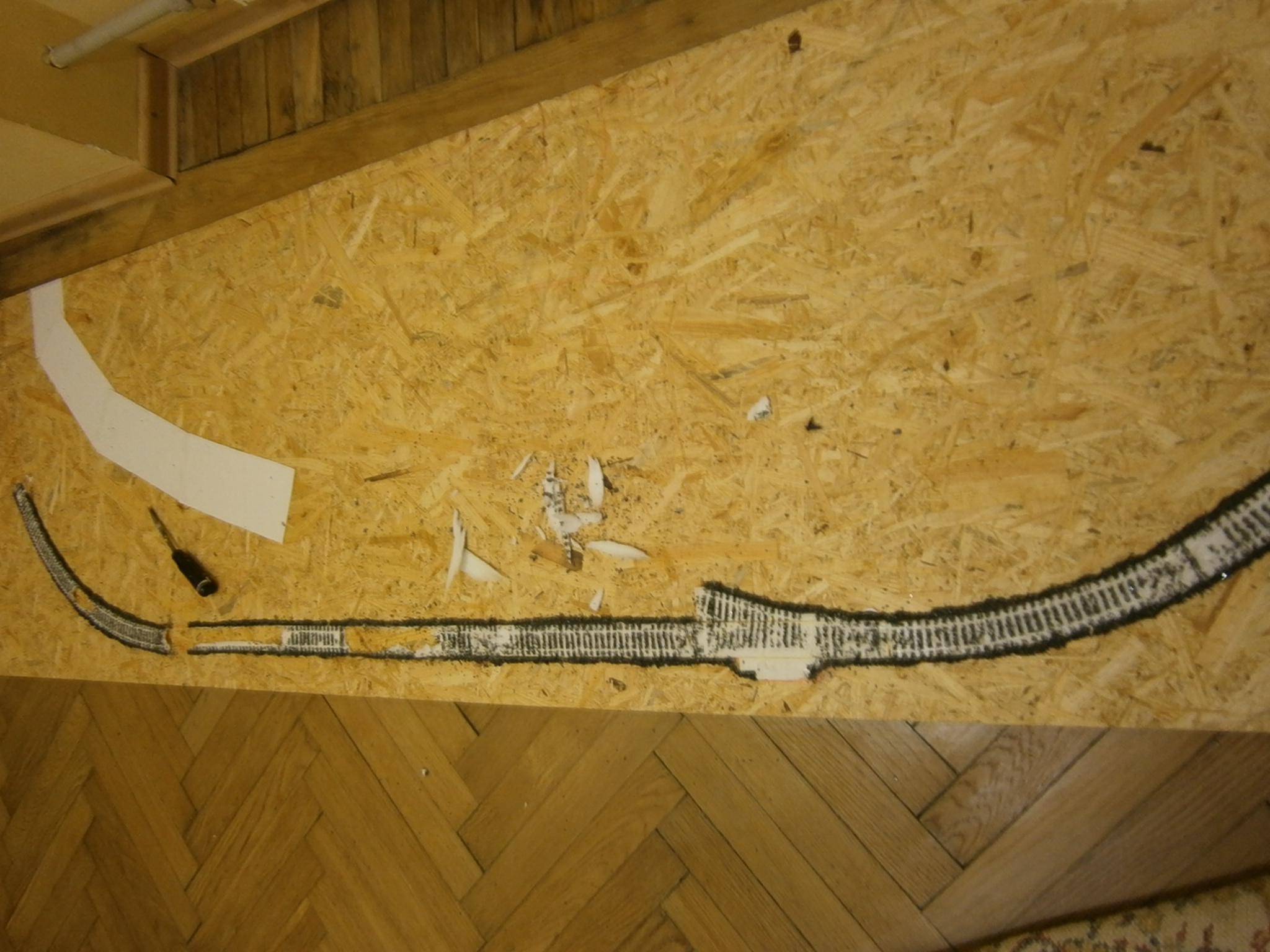 По-третье на неї зручно кріпити рельси на липку сторону. Спочатку одну сторону ( не липку) приклеюю любим спец. клеем для ПВХ, пінопласту, тощо до основи макета і на добу залишаю під вантажем (книжки). Далі кріплю рельси і баласт. Недоліки: