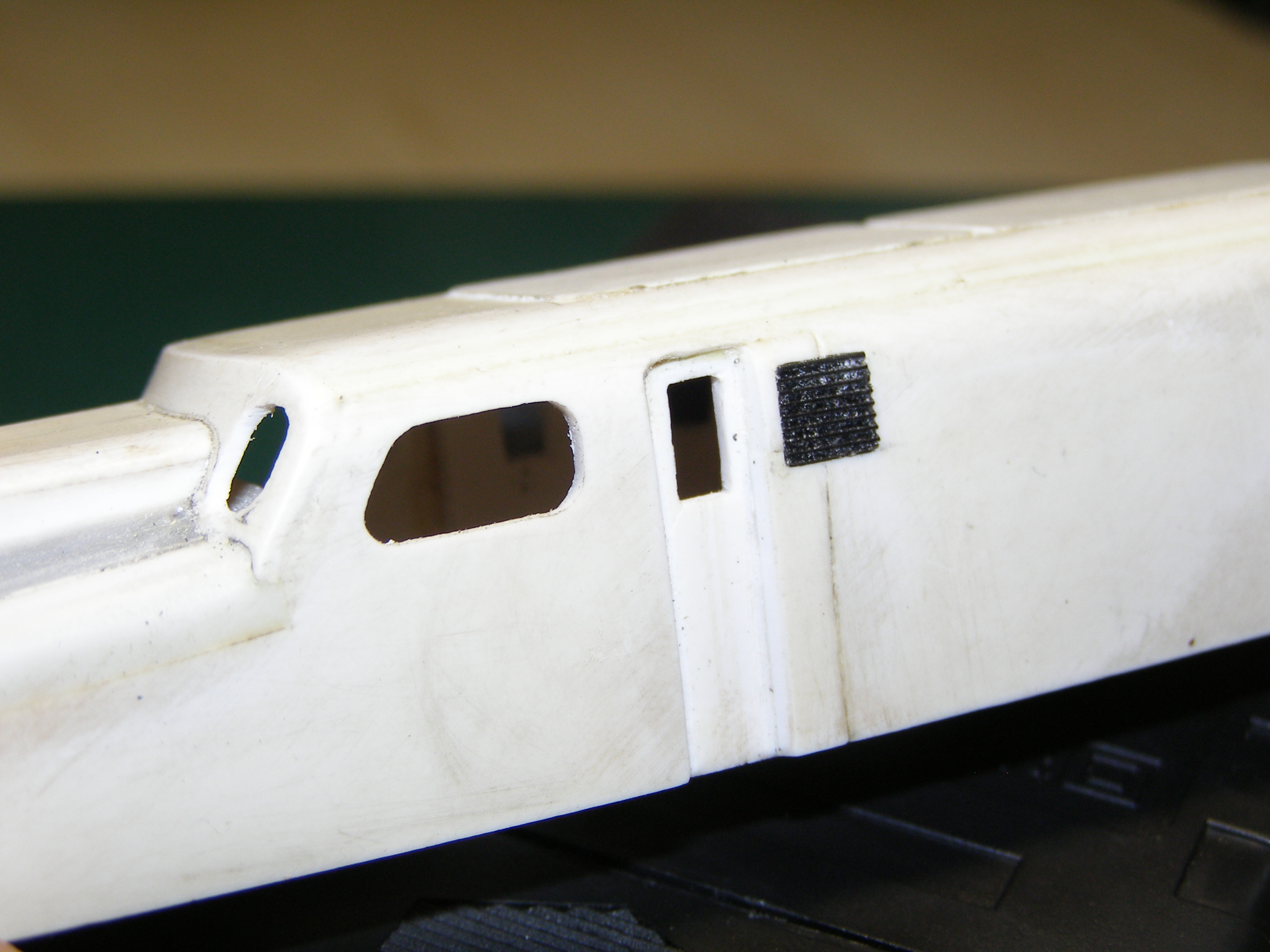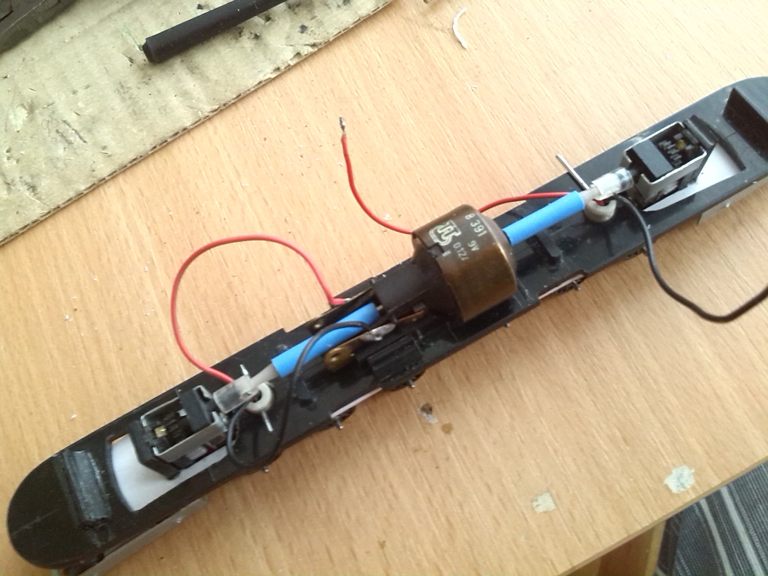 Корпус делал изполистирола. С ним особых затруднений не возникло. Корпус разбил на три части: основная - это бока и крыша и 2 части, назовем их капотами, где расположены пантографы. Вырезал соответствующие детали и склеил отдельно эти части. Детали клеил под прямым углом, в результате в профиль они выглядели в виде буквы П. Дополнительно в углы вклеил по всей длине шва полоску полистирола квадратного сечения для того, чтобы при стачивании углов, т.е. придания им округлой формы, детали держались. Потом вклеил лобовые части в основной корпус и приклеил к нему капоты. Торцевые части клеил из полистирола который был уже изогнут (внутренняя часть двери от холодильника - там есть такие изогнутости для полок). После всего обточил напильником и зашкурил. К сожалению сам процесс не снимал. Вот что получилось: