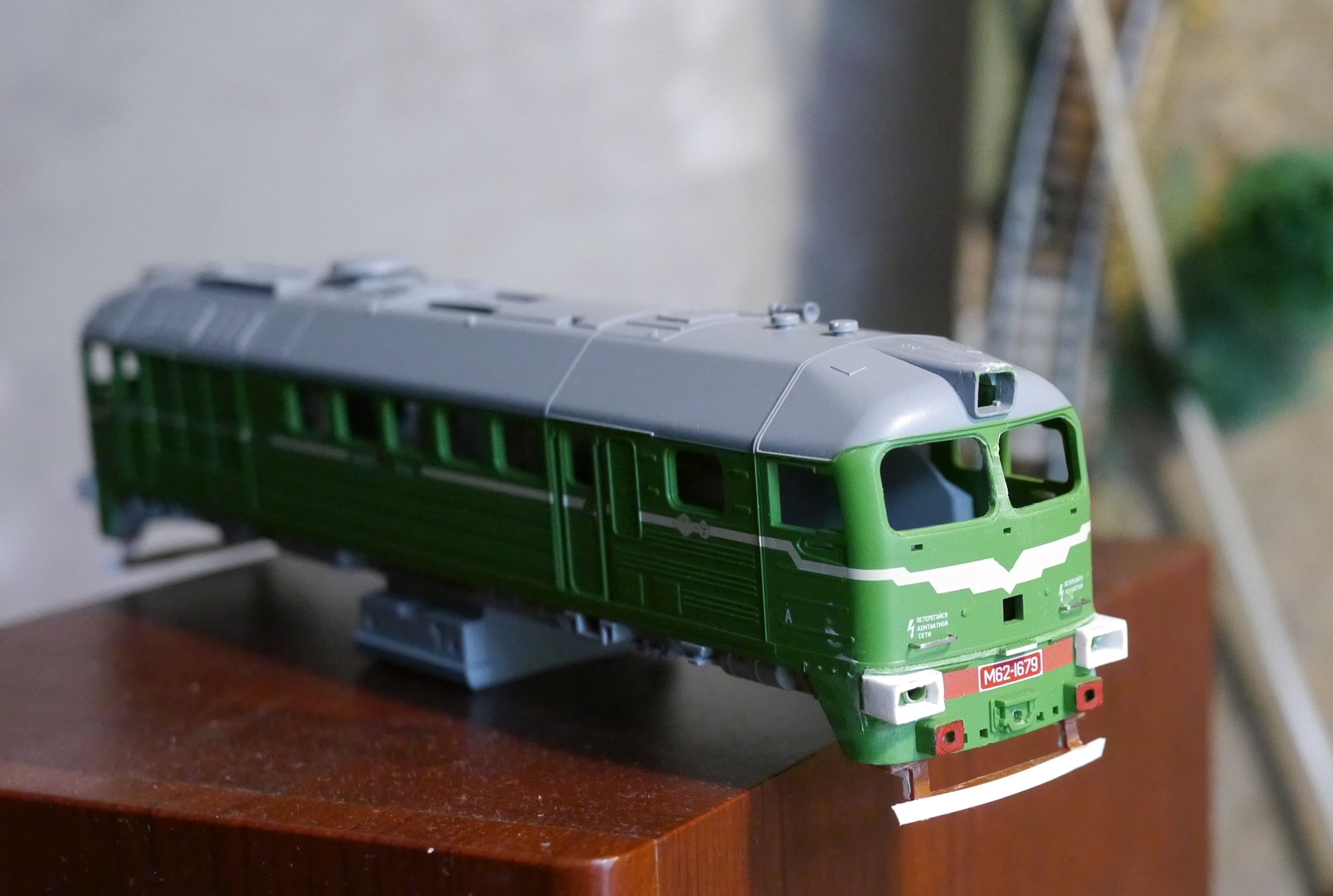 После М62-1 приступ "машколюбства" проходить не пожелал :) На этот раз в работу пошел светло-зеленый корпус М62, который пережил падение с макета. Давно уже хотел "Машку" с квадратными буферными фонарями, как наиболее распространенную в наших краях :roll: Однако делать 2М62 было не очень интересно - уже одну модель "двойника" делал, потому выбор остановился на специфических "Машах" УЗ: