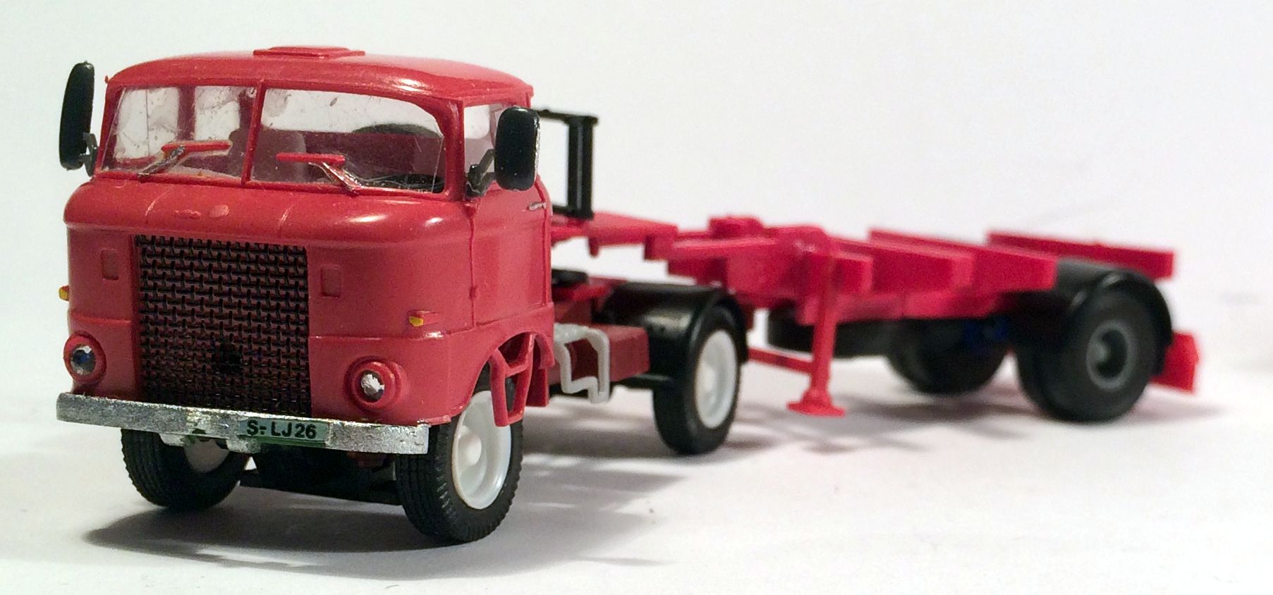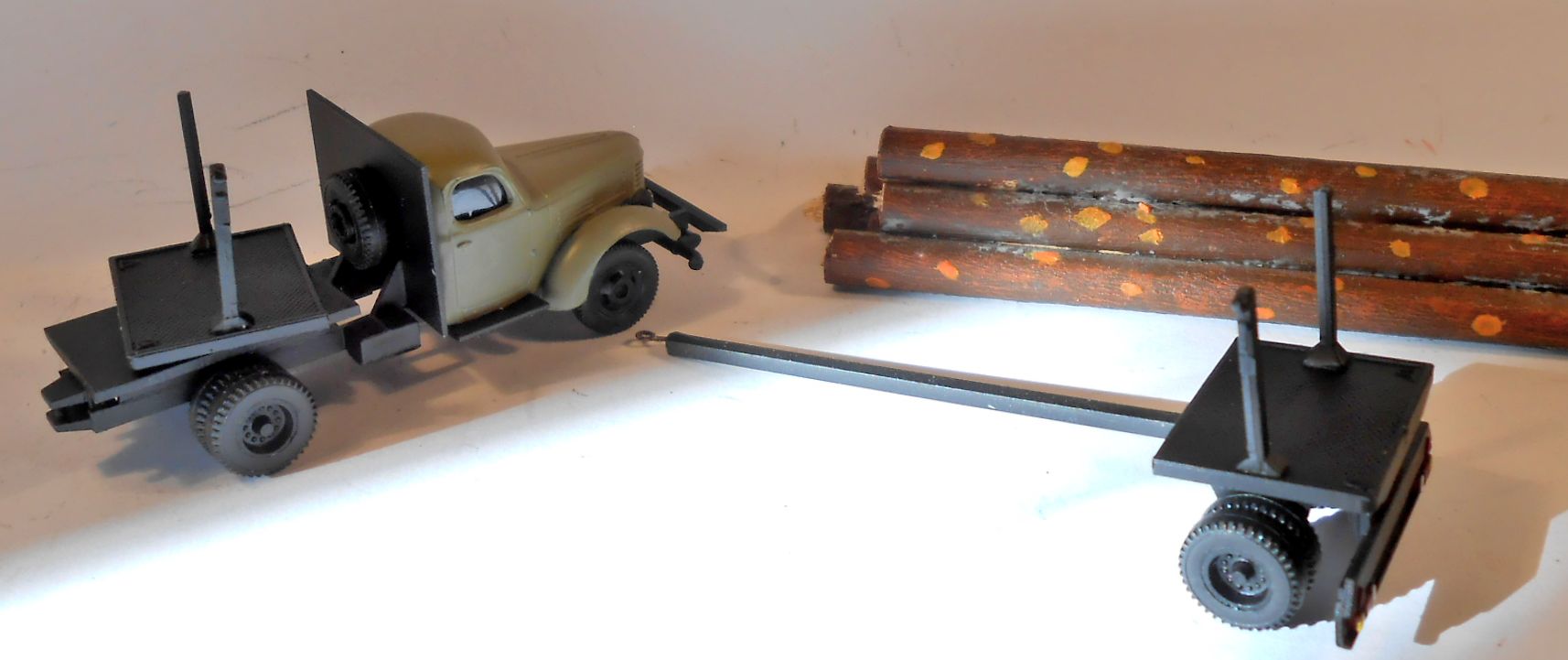 Лесовоз смотрится хорошо, ещё бы цепей крепёжных добавить для солидности. И кстати, задняя балка-бампер на прицепе с задними фарами уж больно "не местная" она, не из той эпохи. На таких прицепах фар вообще могло и не быть, там только красная тряпка висела...