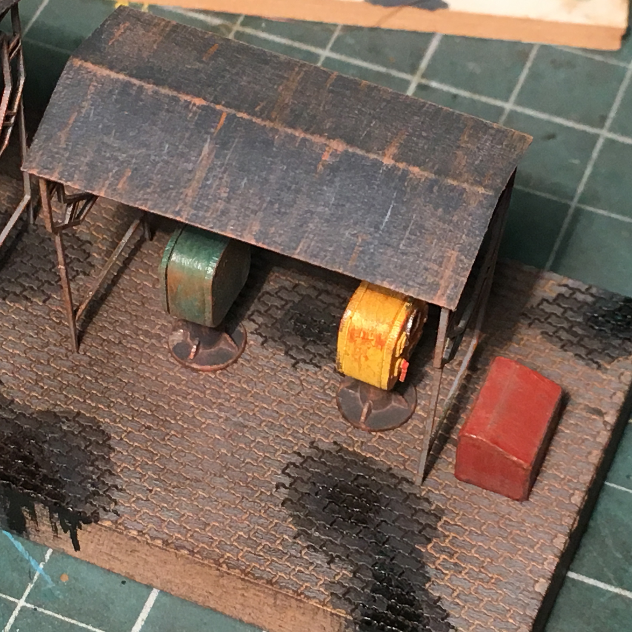 По макету - продвинулся совсем немного. Покрасил цистерны и установил лестницу. Начал заниматься пространством вокруг мачт с песочными бункерами.