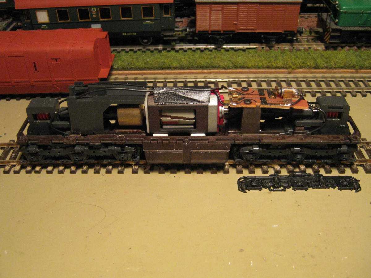 Далее нужно было женить эти тележки с рамой от Пико-Гудзольда. Для этого, я вырезал из рамы механовского лока некоторые элементы и вклеил их в раму от пико (обозначил красным), правда нужно было сразу фотографировать, а то из-за моего вклеенного балласта плохо видно эти элементы.