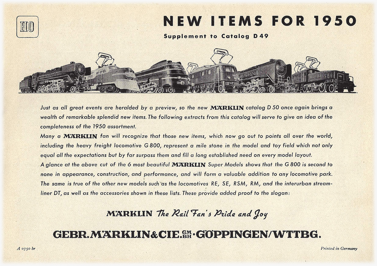Каталог фирмы Marklin, 1950 год. Наверное -это как раз правильно, когда реклама не во вред, думаю именно тогда зародилась культура по увлечению моделями железной дороги. ( не путать с более ранним периодом, когда фирмы производили железнодорожные игрушки) Но немцы, не были бы немцами со своей педантичностью и пунктуальностью, если бы не успели в срок.Модель поступила в продажу в количестве 10000 экземпляров, как Marklin G 800 BR 44 DB. Стоимость модели на то время, была просто фантастически дорогой и составляла 180 DM.