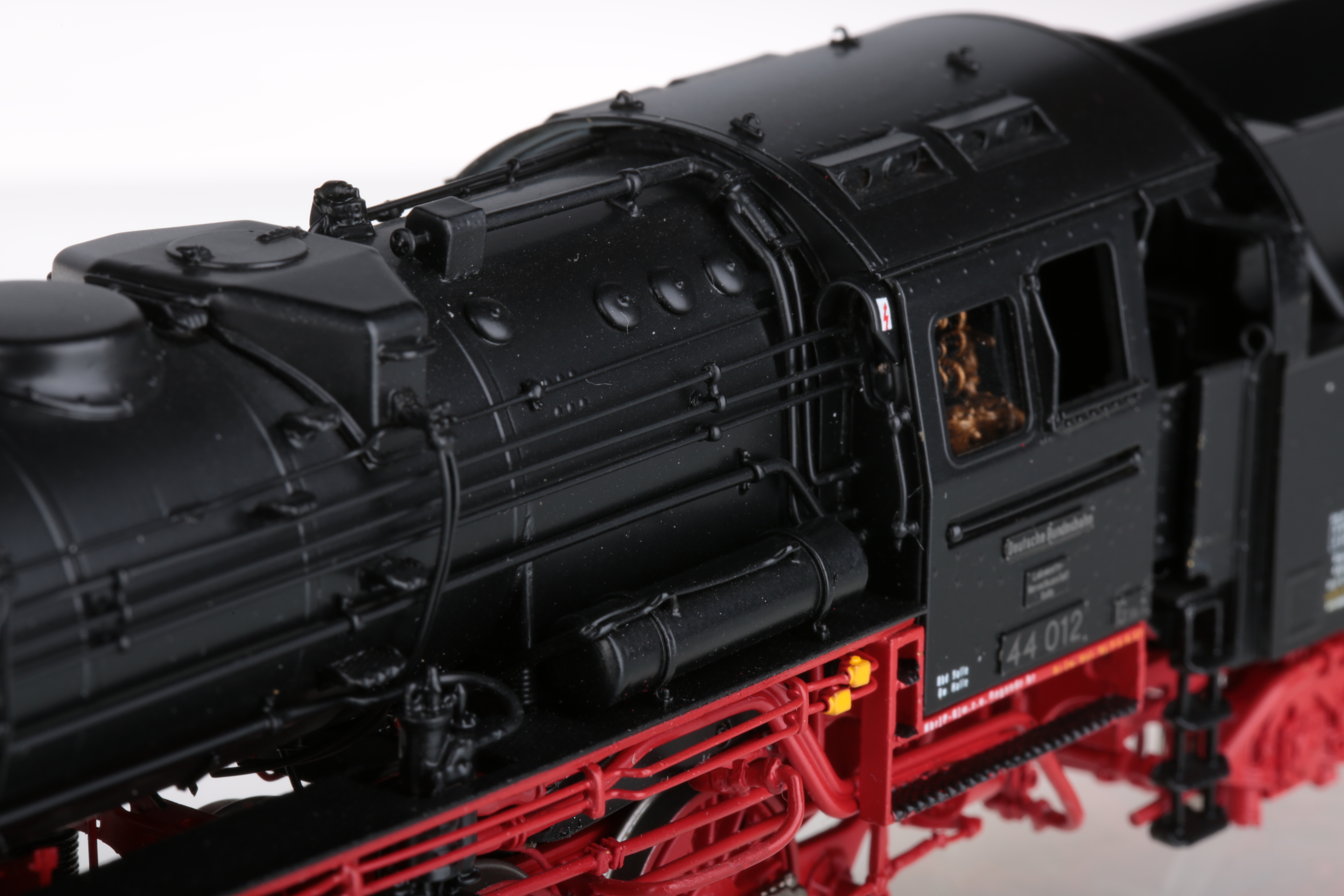 Итак... Micro Metakit art. 99104H. BR 44 012 DR/Ost/,изготовлена в 2000-ом году, всего 50 экземпляров. Примечательно то,что в отличии от других производителей в М.Metakit смоделировали четырехцилиндровую версию этого легендарного локомотива, в отличии от классического трехцилиндрового, которую делают практически все фирмы, выпускающие ж/д модели.Очень кратко об истории прототипа. Всего Геншелем в 1933году было выпущено два аналогичных паровоза BR 44 011/фабричный номер 22000/ и BR 44 012 /фабричный номер 22100/, который после войны и попал на территорию восточной Германии, где недолго использовался в качестве подопытного пациента и успешно в 1966-67 годах, /если ошибаюсь- поправте/был порезан и разобран на те металлические составляющие, из которых когда-то был сделан...