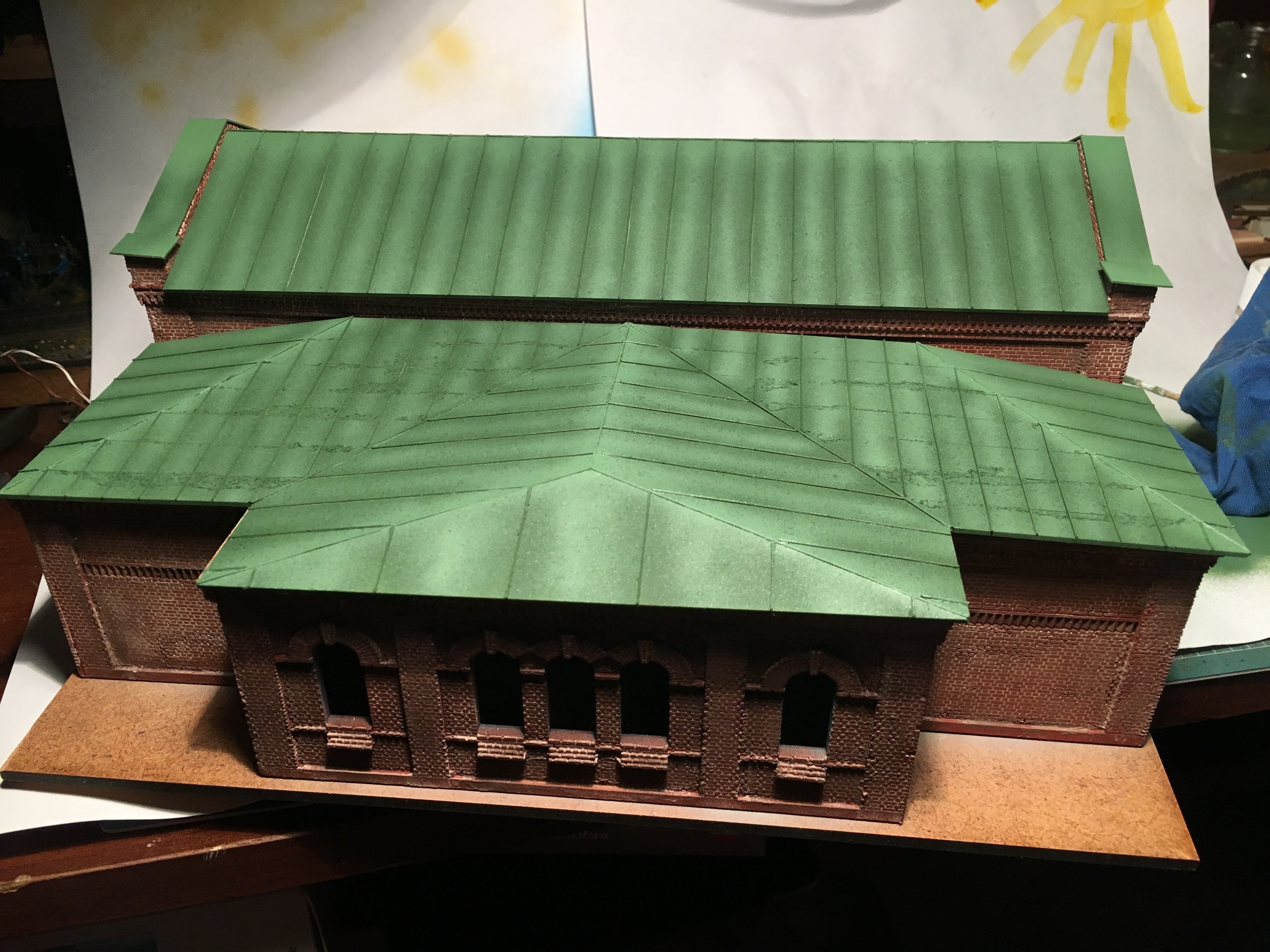Добрый день. Поработал над крышей. Не скажу, что я доволен, но править уже не буду. Есть пара мыслей по мелочам на крыше пристройки и возможно, кое-что из мелочей, добавлю на крышу депо. Ну и трубы конечно будут. А вечерком, поделюсь фотографиями с выставки в депо Подмосковная. В честь дня жд моделизма, проходили и проходят некоторые мероприятия и выставка.