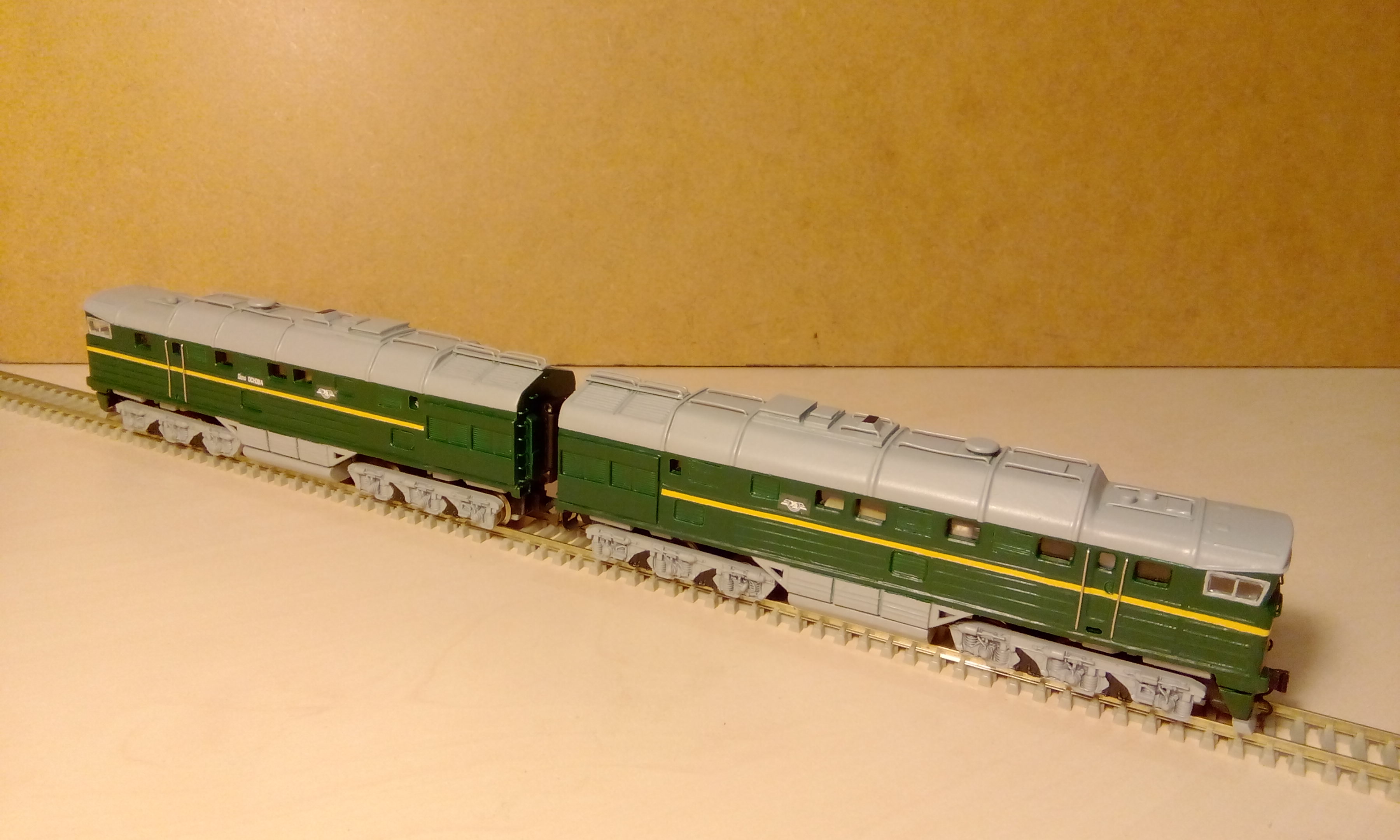Настало время выкатить долгожданный (во всяком случае, мной) тепловоз по имени 2ТЭ116. Хотел именно основянский, но идеально правильного номера в декалях не было, так что на него не смотрим ;) По технической части - 2 х БР130, один из которых - с приводом. Иммитация автосцепок на стороне кабин снимается, и можно установить любую из сцепок, хоть селедку. Будет потеплее - пойду катать модель по реальному перегону :)