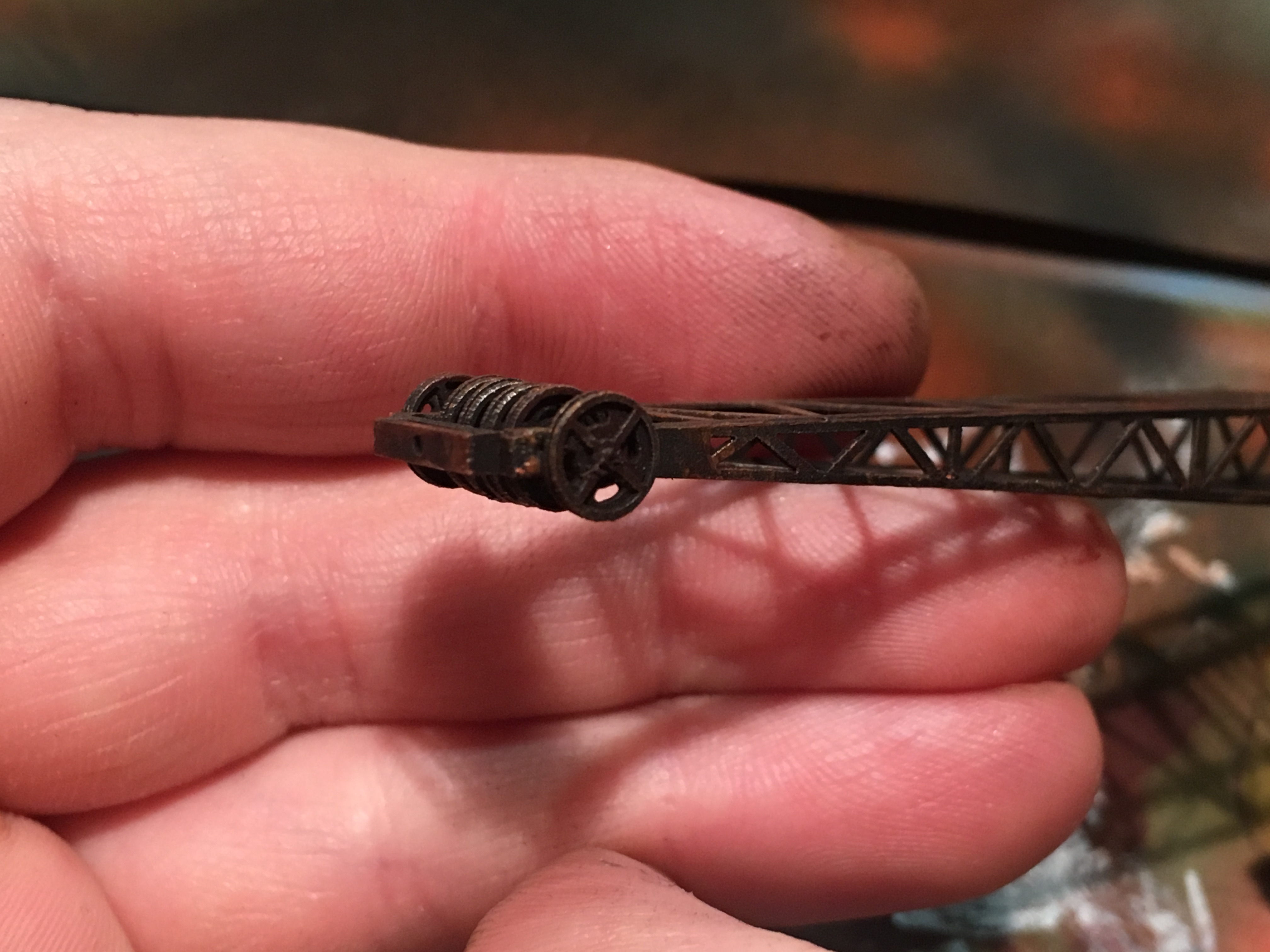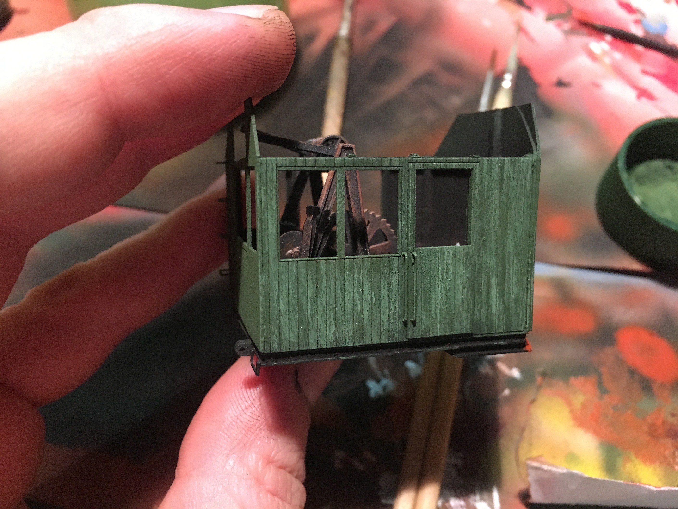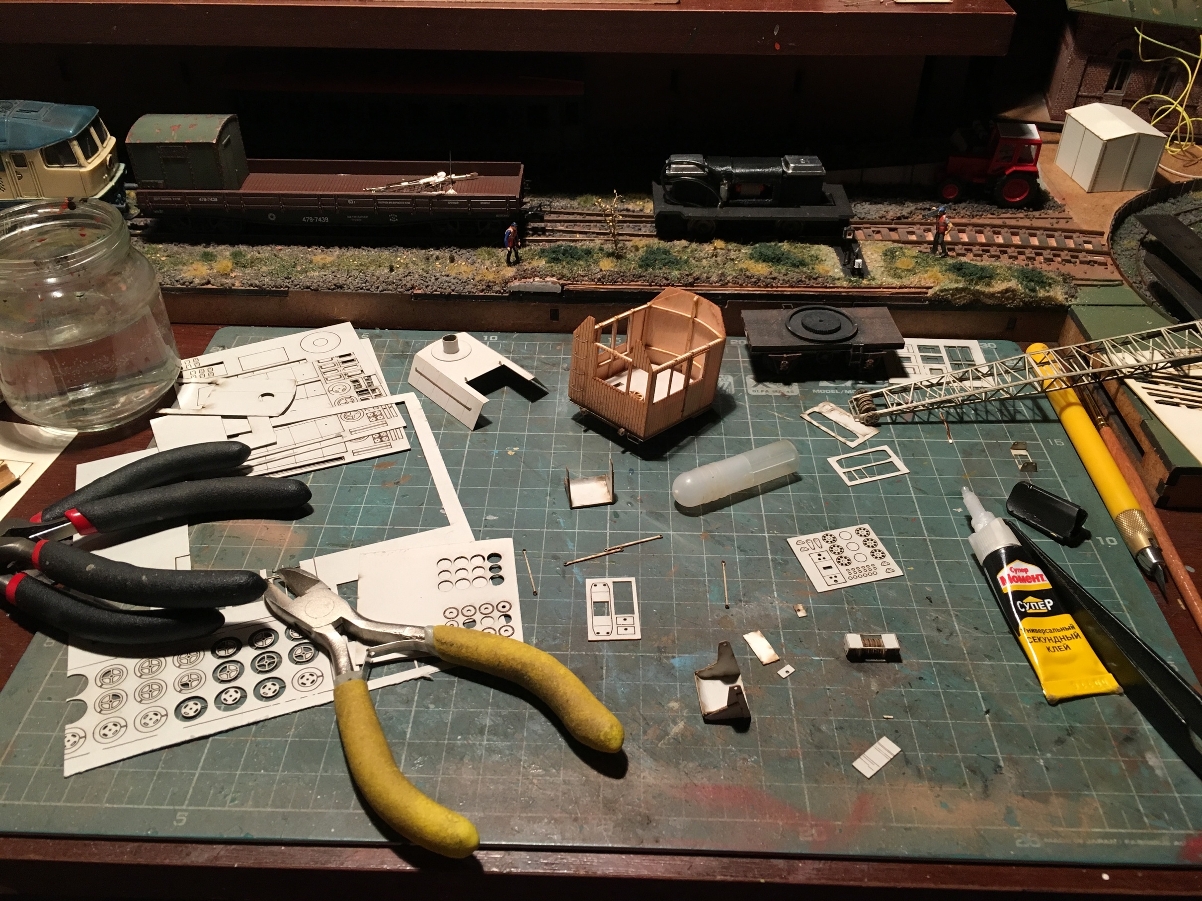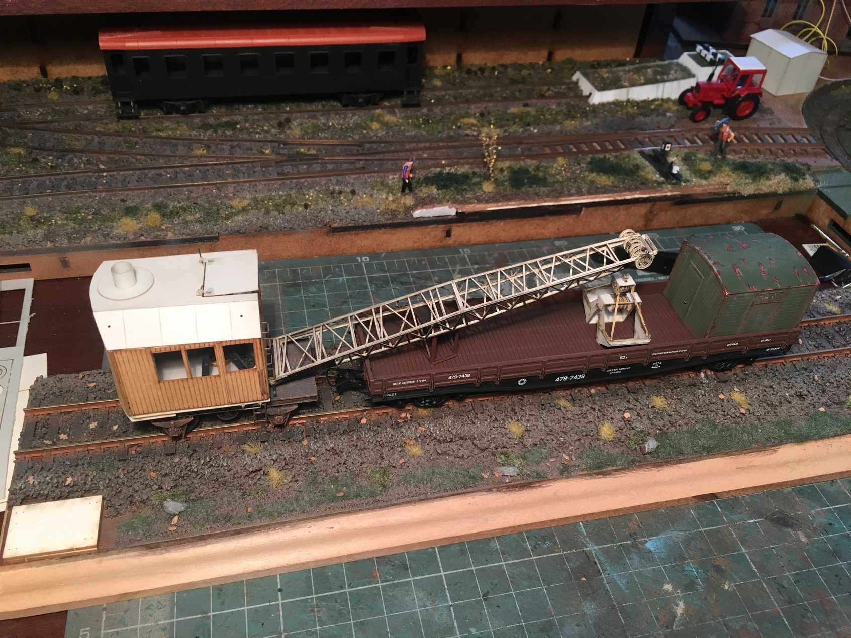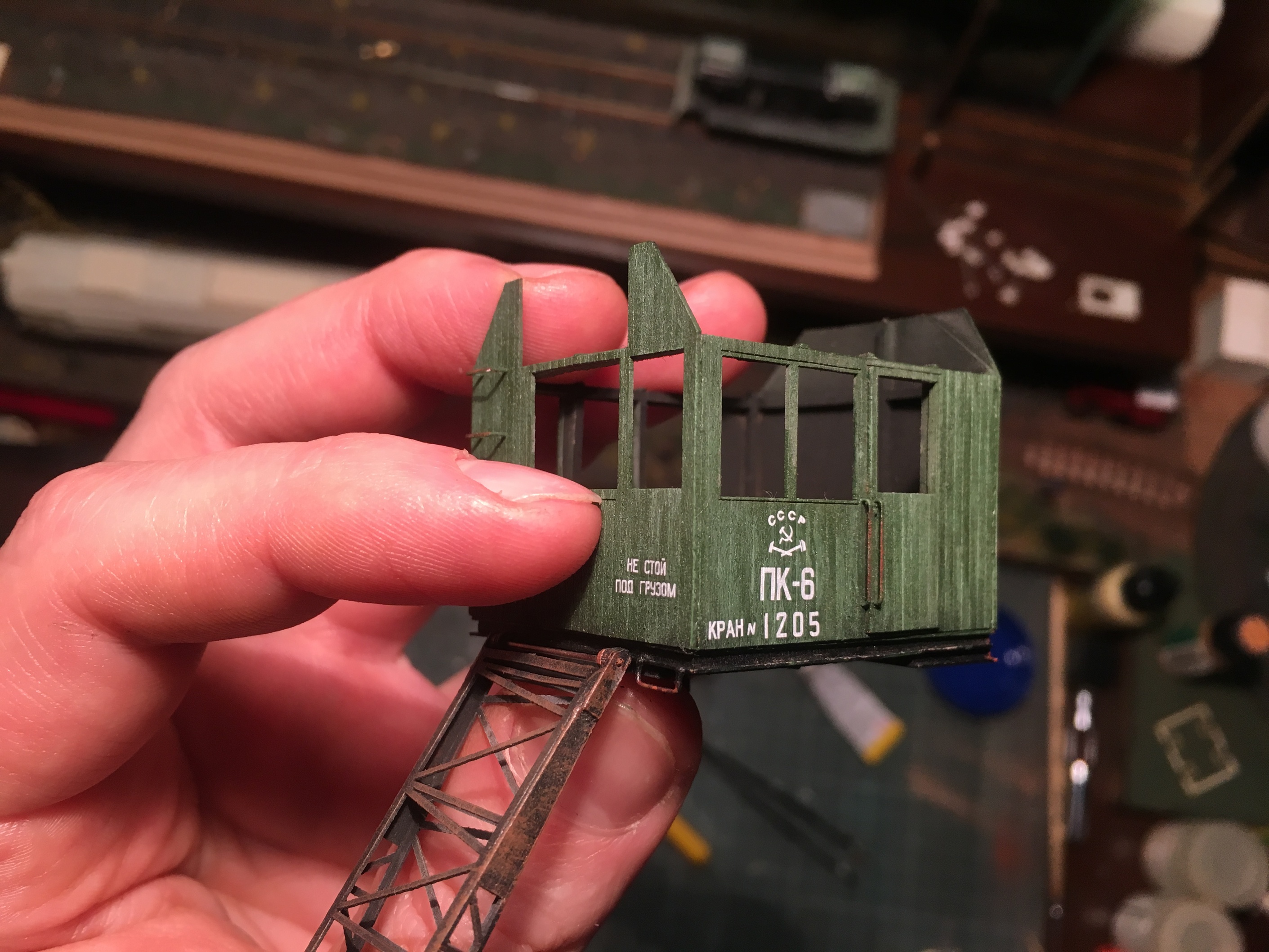 Собственно на этом всё пока. Осталась крыша, точнее её тонирование и протяжка тросов. И на днях решил, что будку надо на подшипник посадить. Благо, что микроподшипники были в наличии. И не могу решить, в каком положении оставит стрелу. Кран планировался для работ в депо. Выгрузка песка и так далее. На средней высоте наверное оставлю, а за счёт вращения будки, как бы и катиться сможет и в стороне от колеи, производить выгрузку и прочие работы.