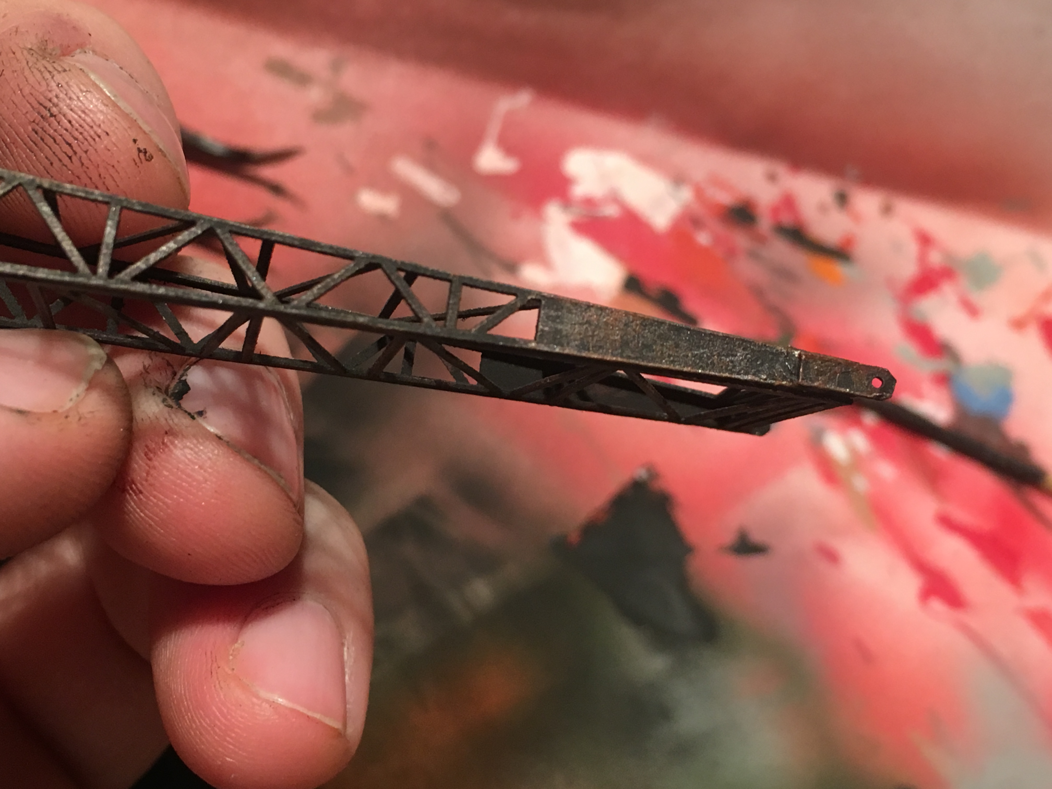 На этапе, изображённом на фото выше, муза ушла. Делеко и очень надолго. Пошла постройка макета и так далее. Недели полторы назад, я решил достроить данную модель. Оставалась крыша, грейфер, покраска, декали и протяжка тросов. Ниже фото процесса с описанием.