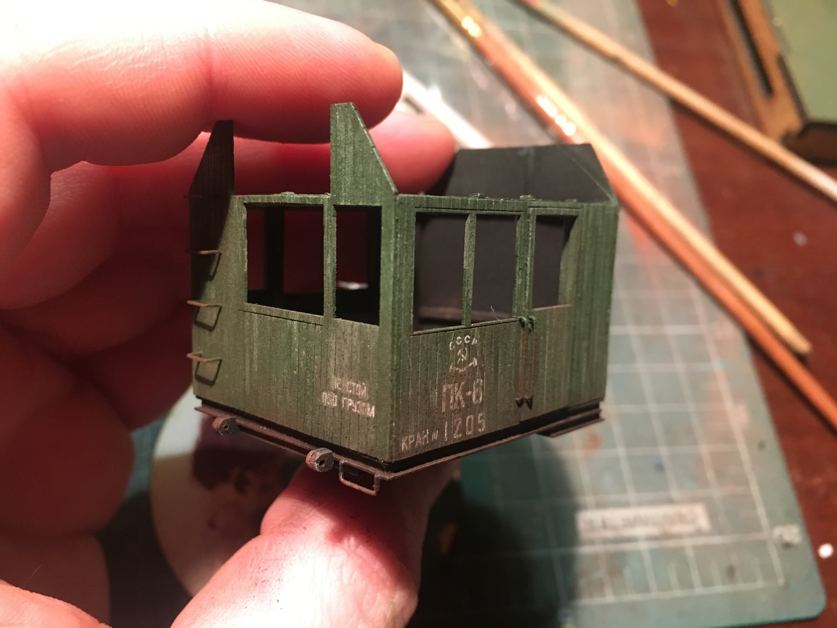 Ну и раз уж засветилась будка с платформой, напишу и по ней. В серию запустил три типа будок, на платформы хозяйственных и восстановительных поездов. Да и в платформы сопровождения кранов, они тоже отлично заходят. Собственно один из тестов, я запустил в оборот:
