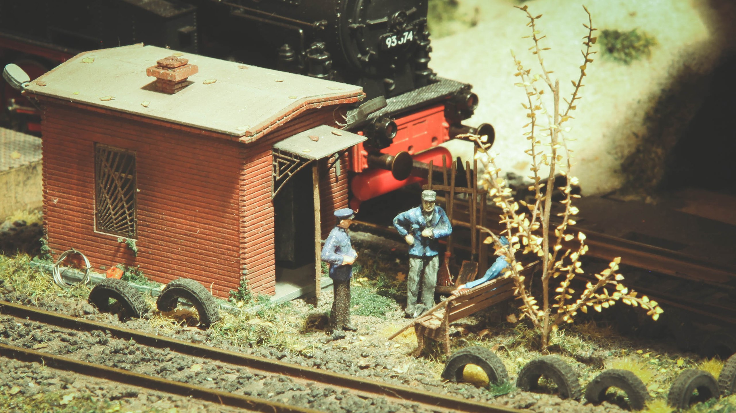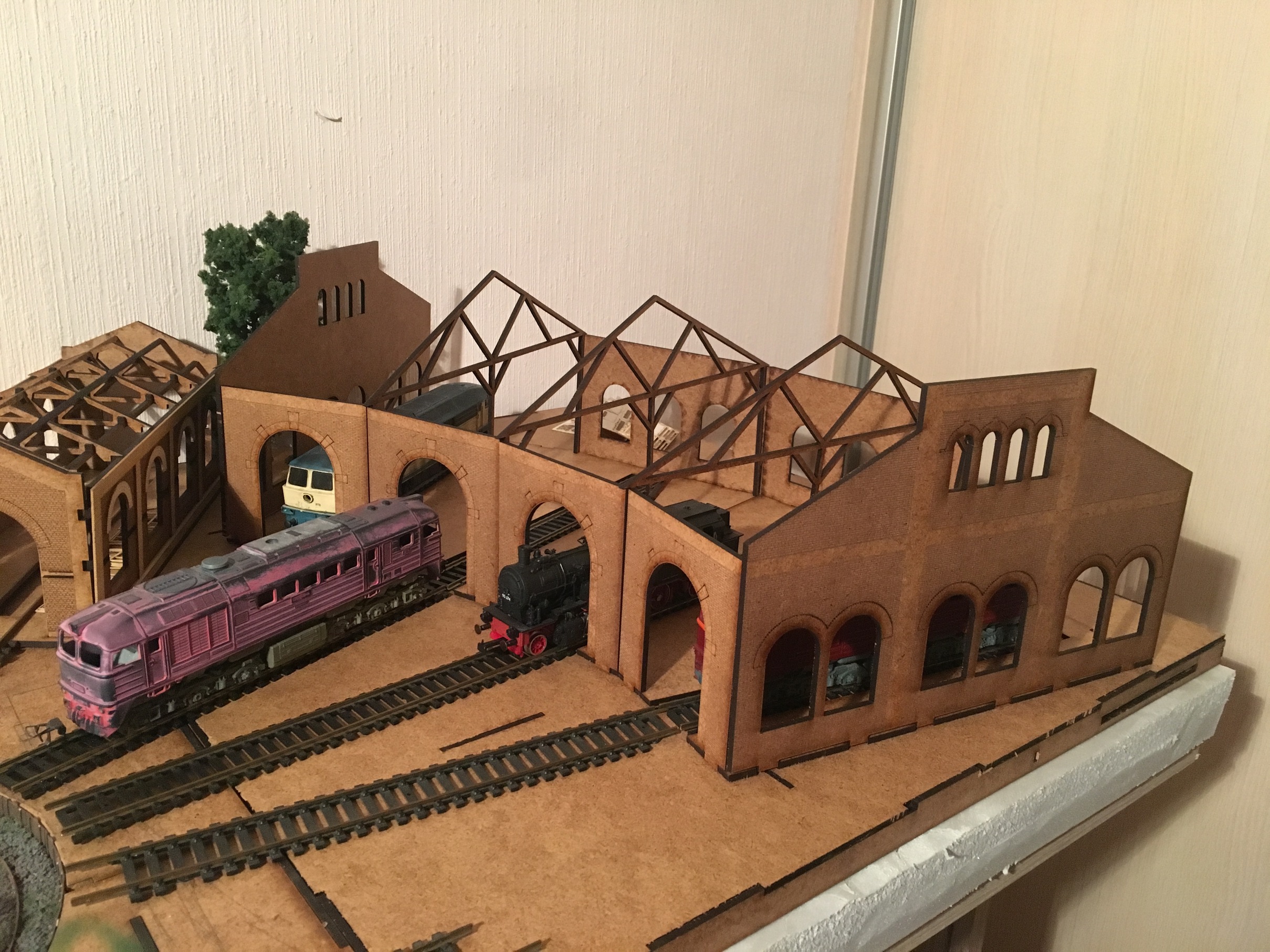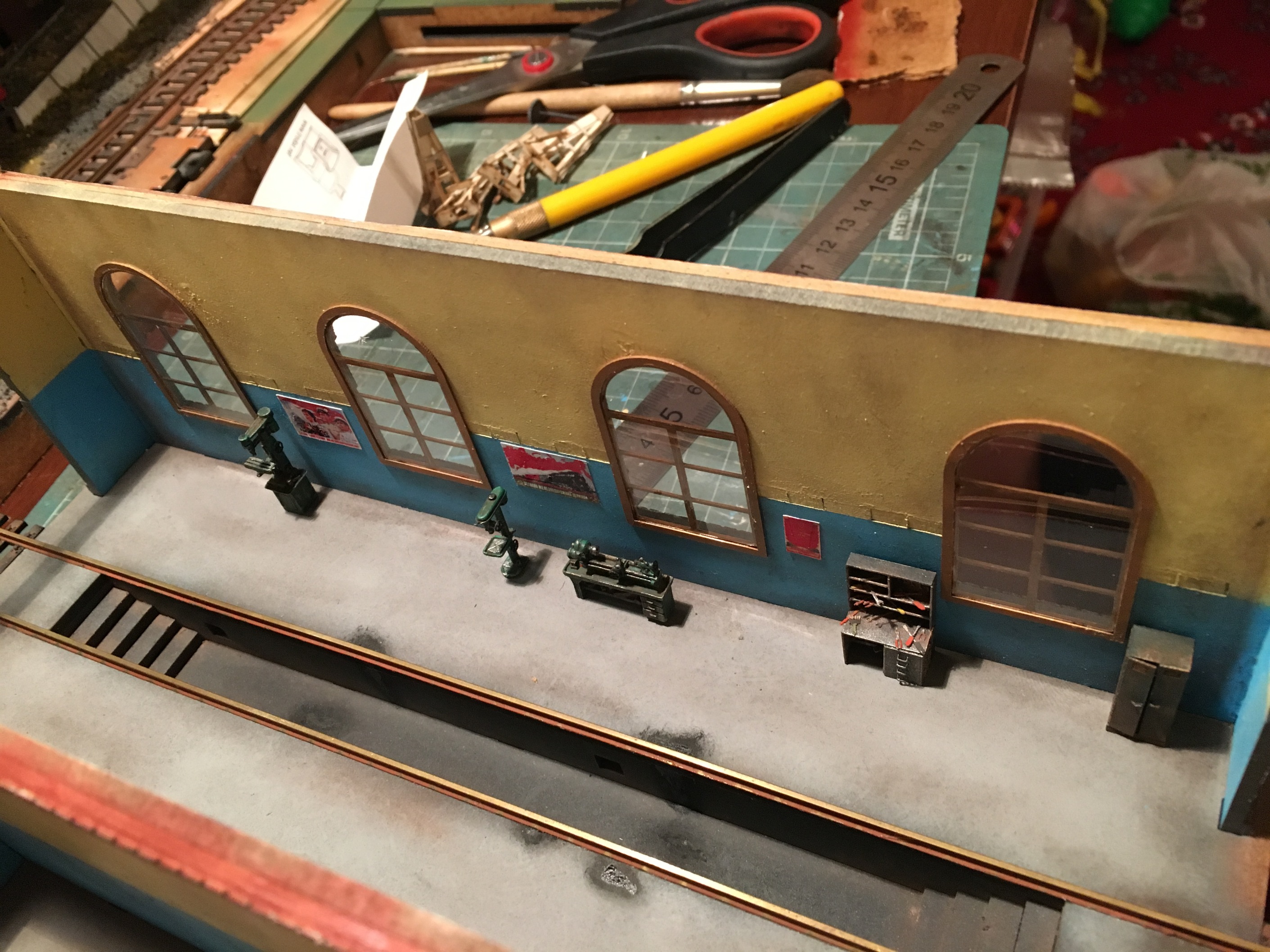 И дальше взялся за здание. Сделал уличное освещение, развёл часть проводки внутри, отсеклил помещение самого депо, начал меблировку и украшательства. В пристройке как будет видно на фото ниже, как я и писал, обставил условно, только комнату, выходящую к зрителю. Приспичит, сделаю в других потом. Результаты всей этой вакханалии ниже.