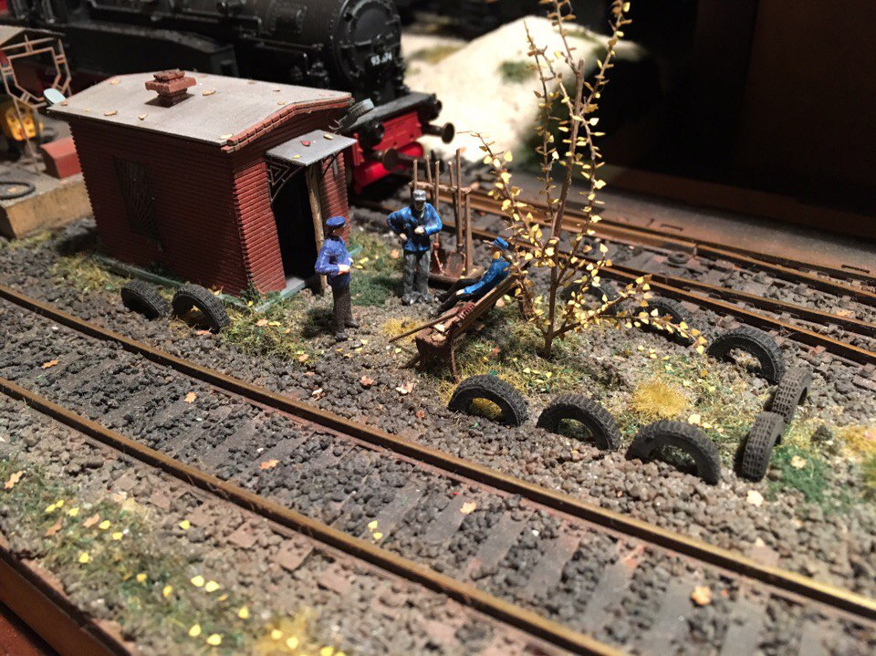 Далее, буквально несколько дней назад, нашёл наконец собранные мною колёса, под обвес буксира в 1/100. Делал очень давно и в переездах, они потерялись. Нарезал половинками и оформил путейку ещё немного. Получилось сочно на мой взгляд.