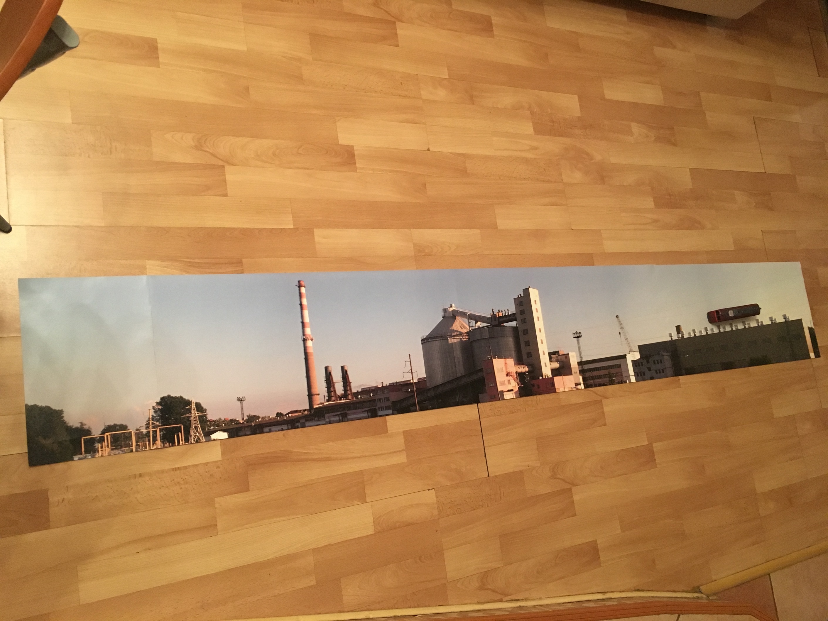 Всем добрый день. Тём, соединить не получилось бы из-за габаритов макета по ширине. Так что да, будет отдельным. Ничего не делал толком. Аж бесит, когда есть муза, а нет времени. Склеил все сегменты подмакетника в единый кусок. Брат в типографии, распечатал подготовленные мной файлы. Два фона. Промзона и припода. Пока га двухсторонний скотч, приклеил промзону. Склеено из кусков 680х300. Бумага очень восприимчива к клею. Сразу её ведёт. Так что это временный фон. Потом подберу лучше и качественнее напечатаю единым куском. На фото, где фон на полу, закинул на него кузов Машки. Для хохмы. Затерялся кузов :-)