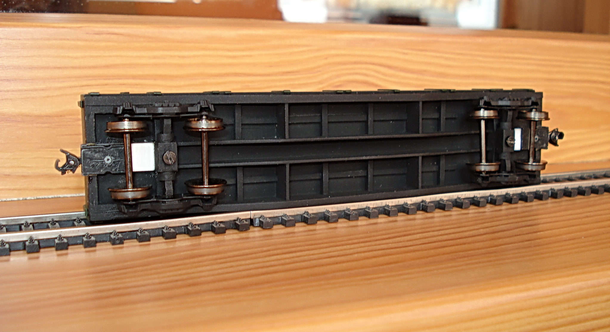 Да,ходовки серые хорошо видно на полке,а чёрных не видно.А полувагон коричневый из спичек сделан и канцелярских деревянных линеек.Раньше на нём и тележки тоже из спичек были ,потом поменял на фирменные.