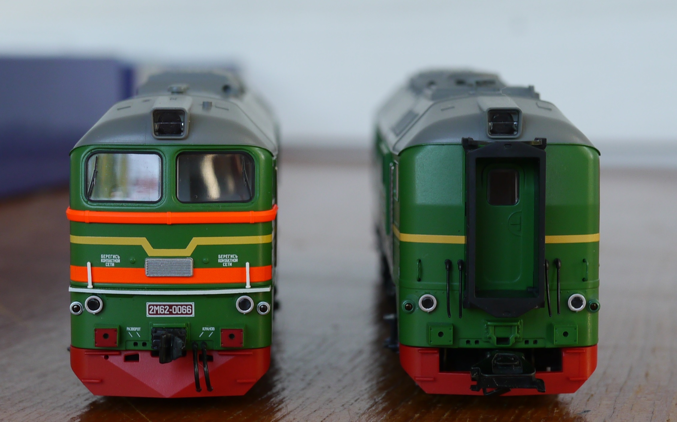 Наконец дождался новинку – двухсекционную версию тепловоза М62, известную в народе как «двойная Машка» или 2М62. Нельзя сказать, что данная модель сделана «с нуля»: одиночные М62 производитель уже лет 10-12 выпускает. Однако первые модели в советской ливрее были перекрашенной немецкой версией тепловоза. Производитель оставлял тормозную систему европейского образца, буфера, винтовую упряжь и т.п. Несмотря на это, многие любители «нашей» темы радовались покупке. Отличия не сильно влияли на узнаваемость тепловоза, и при желании модель можно доработать без значительных трудозатрат. Теперь посмотрим, насколько хорошо австрийцы справились в этот раз. Для сравнения взял односекционный М62 от «Фляйшмана» (тот же «Роко», просто перепакован в коробку «Фляйша). Было бы интереснее сравнить с еще более ранним вариантом модели, но увы - в коллекции есть только эта одиночная «Машка».