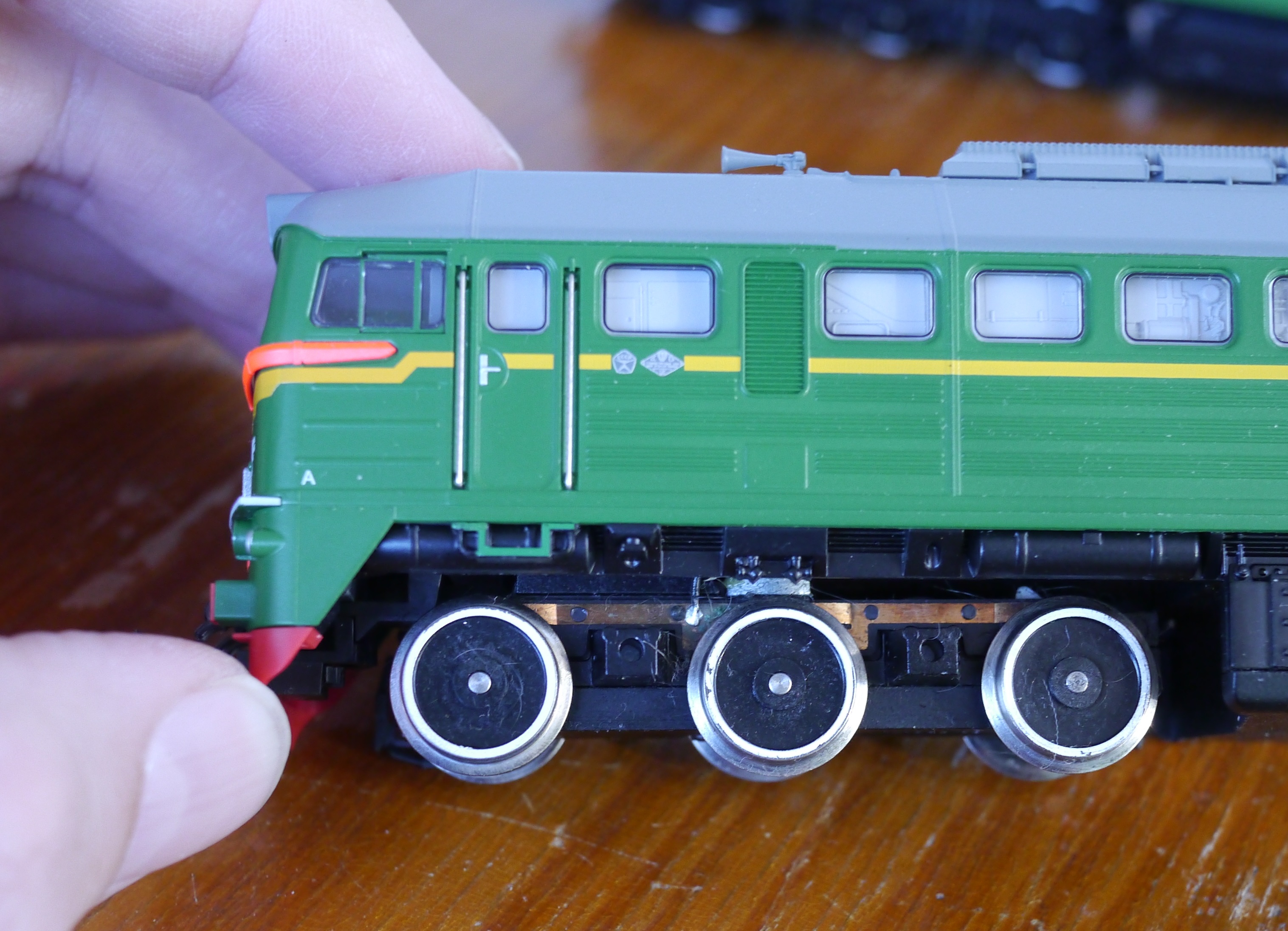 «Роко» на сей раз постаралась отобразить на модели именно советские особенности тепловозов. Первое на что обратил внимание – это тормозные цилиндры. Наконец-то на телеге цилиндр один, по центру, как положено. На «Фляйшмане» - два, по краям (еще и отображены половинками).