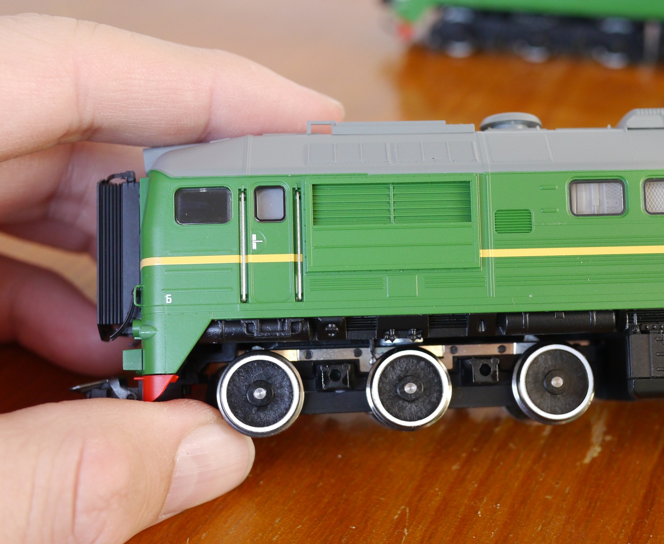 Накладные детали к модели позволяют сделать как «полочный», так и «покатушечный» вариант. У тепловоза легко отсоединяется НЕМ-шахта, ставятся прототипичные путеочистители. В розетку устанавливается имитация СА3. Есть даже полноценные жоксы (кабеля межсекционных соединений).