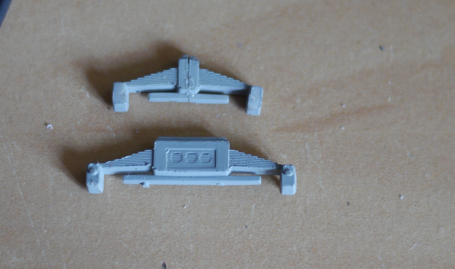 Пригодились валяющиеся третий год в коробке рессоры от румынского тепловоза. Из них методом "распилить/склеить" удалось получить достаточно похожие изделия. Внизу - донор, вверху - получившийся "наборчик" для склеивания.