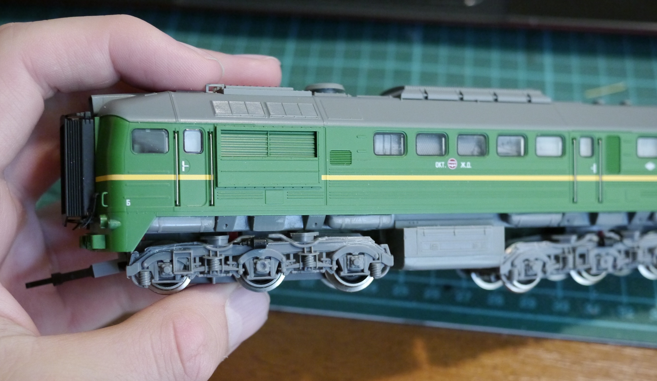 Сразу стало очевидно, что Roco на раму не налазит. Надо обтачивать. В результате вышло нечто такое: Дальше надо было поработать над телегами. Убрать европейские тормозные цилиндры по краям, установить новые по центру. Присоединил НЕМ-шахту. Динамики нет, но подвижная во всех направления. Пока (до покраски рамы) смотрится так: