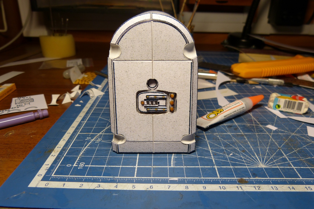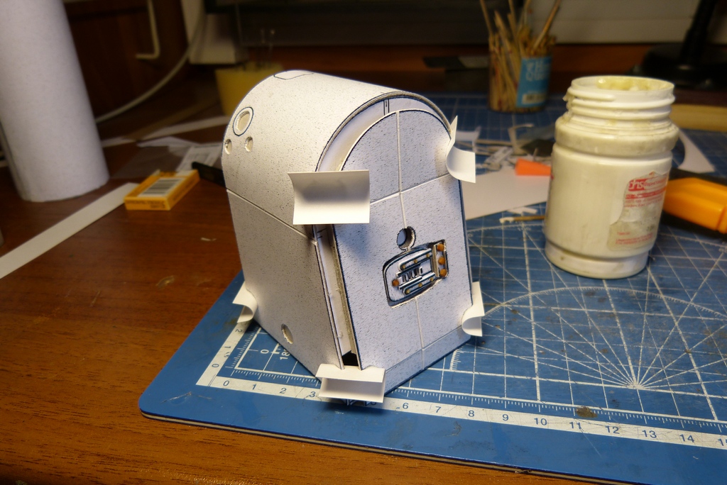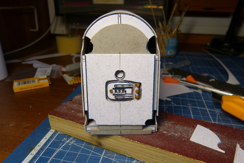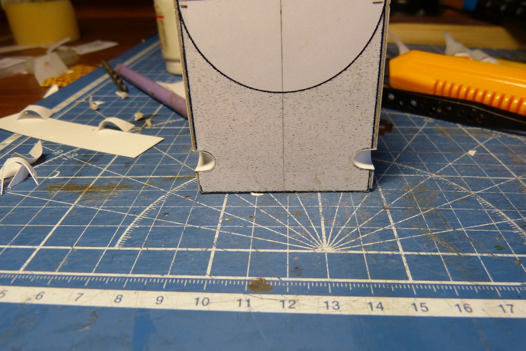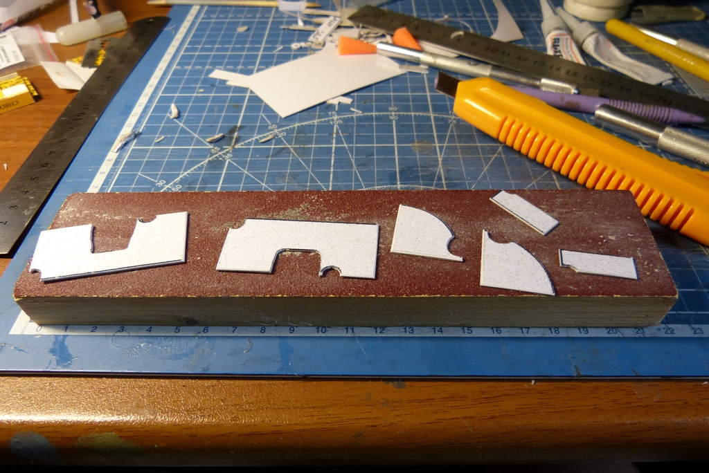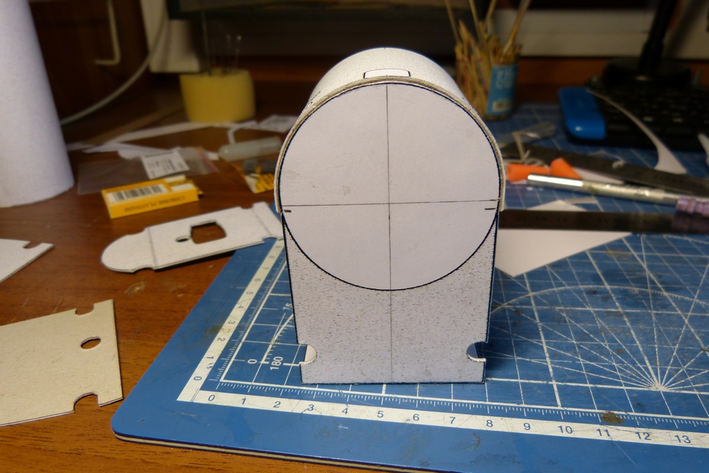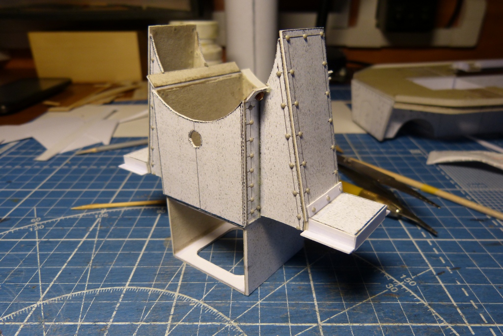 начал сборку кожуха жаровой коробки,детали обшивки даны целиковыми,но зная конструкцию этого узла раскроил верхний и лобовой листы,чтобы швы были после грунтовки и покраски хорошо читаемы немного бруском снял фаску с граней ну и собрал,так как жаровая коробка находится внутри кожуха и окно топки находится на корпусе жаровой коробки и она должна смотреться утопленой сделал имитацию углубления,ну короче вот