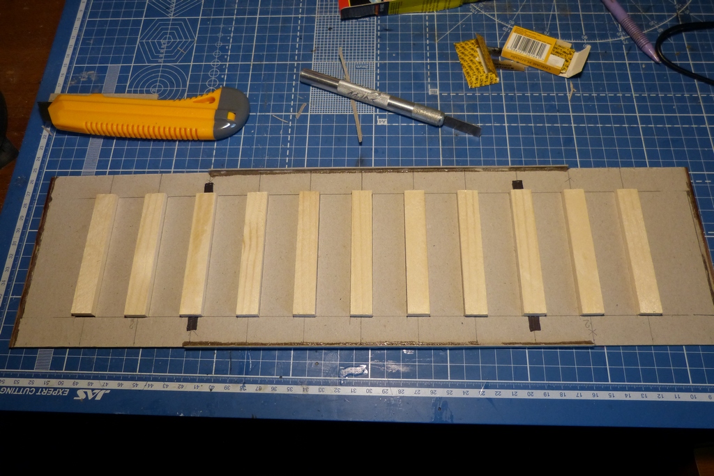 Был чуть занят и решил от мелочевки отдохнуть,напилил шпалы,сделал шаблон направляющими для шпал,просверлил зеркало,наклеил на основу , вклеил в подставку , установил шаблон и шпалы, третья шпала с каждой стороны со штырьком,в последубщем шпалы соединяться с рельсами и крепление и полотно будет съемным,такой опыт уже есть с паровозом Саламанка.
