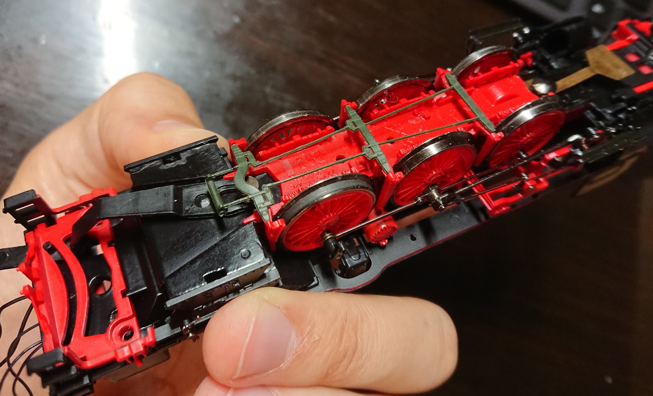 Разобрав модель, первым делом чищу и обслуживаю основной редуктор. А также блокирую фривил специальной деталькой из коробки и начинаю сборку модели. Поскольку модель была трехрельсовая с лыжей, то производитель любезно избавился от детали имитирующей тормозные тяги. Заказал похожую от Роко и снял место установки. Кстати, нижняя фиксирующая планка имеет внутренние защелки - поэтому тут нужно быть крайне аккуратным: Немного легкого допила и деталь стала как родная.