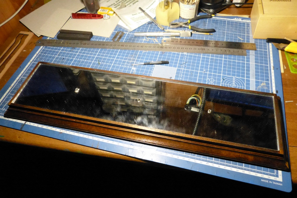 Вырезал зеркало на подставку,установил в шаблон шпалы,поставил установочные штифты в подставку (потом подкрашу) и сделал рельсы