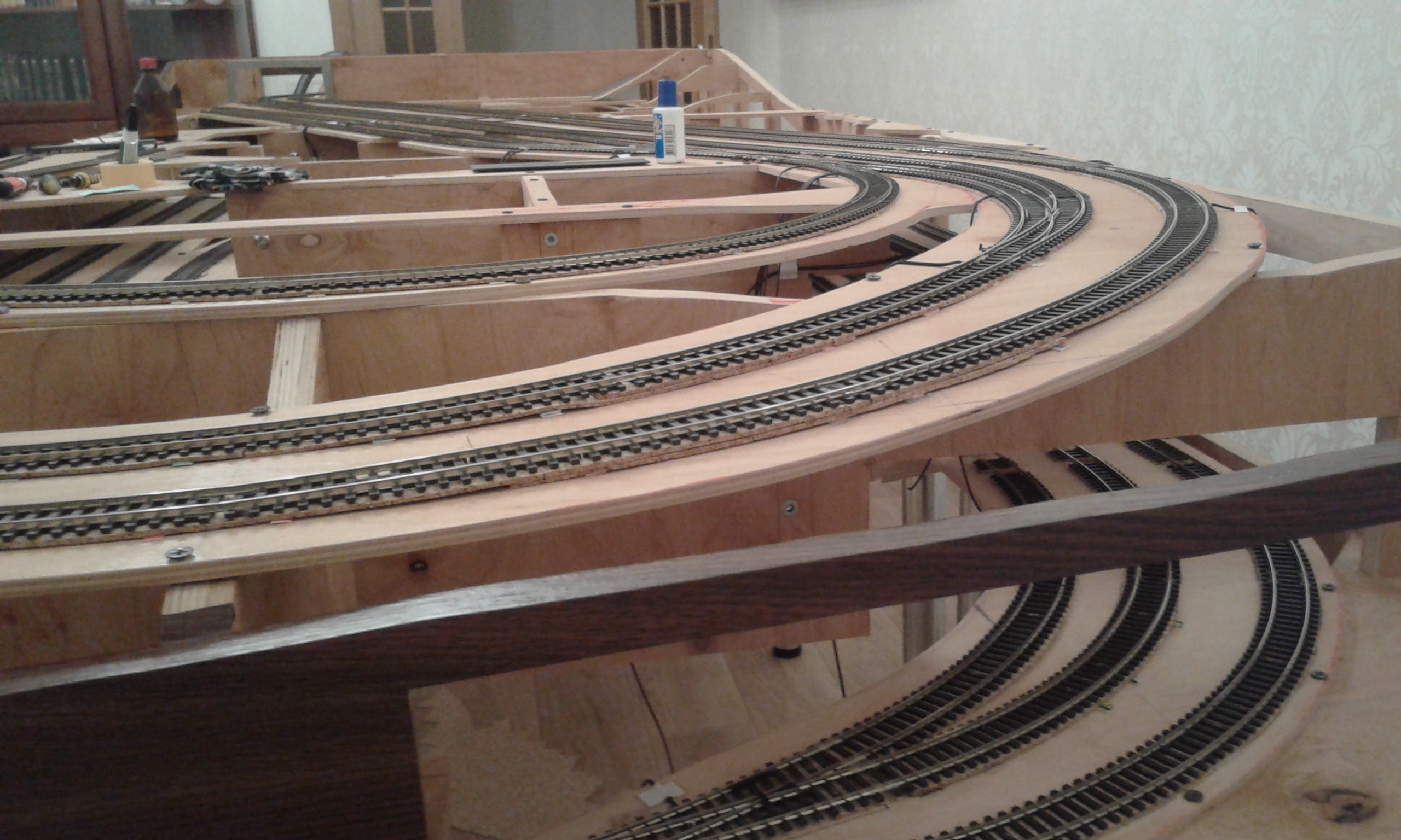 Естественно пришлось пожертвовать некоторыми моментами в угоду габаритов. Настоящие железнодорожники меня раскритикуют за отсутствие некоторых путей и съездов, необходимых для промежуточной станции))))) Я всё это прекрасно понимаю, но намеренно пришлось пожертвовать правильным путевым развитием в угоду длины составов. Все-таки мой макет - не учебное пособие, а объект удовольствия дома, и выбирая между правильным путевым развитием станции и длиной путей станции я выбрал последнее)))