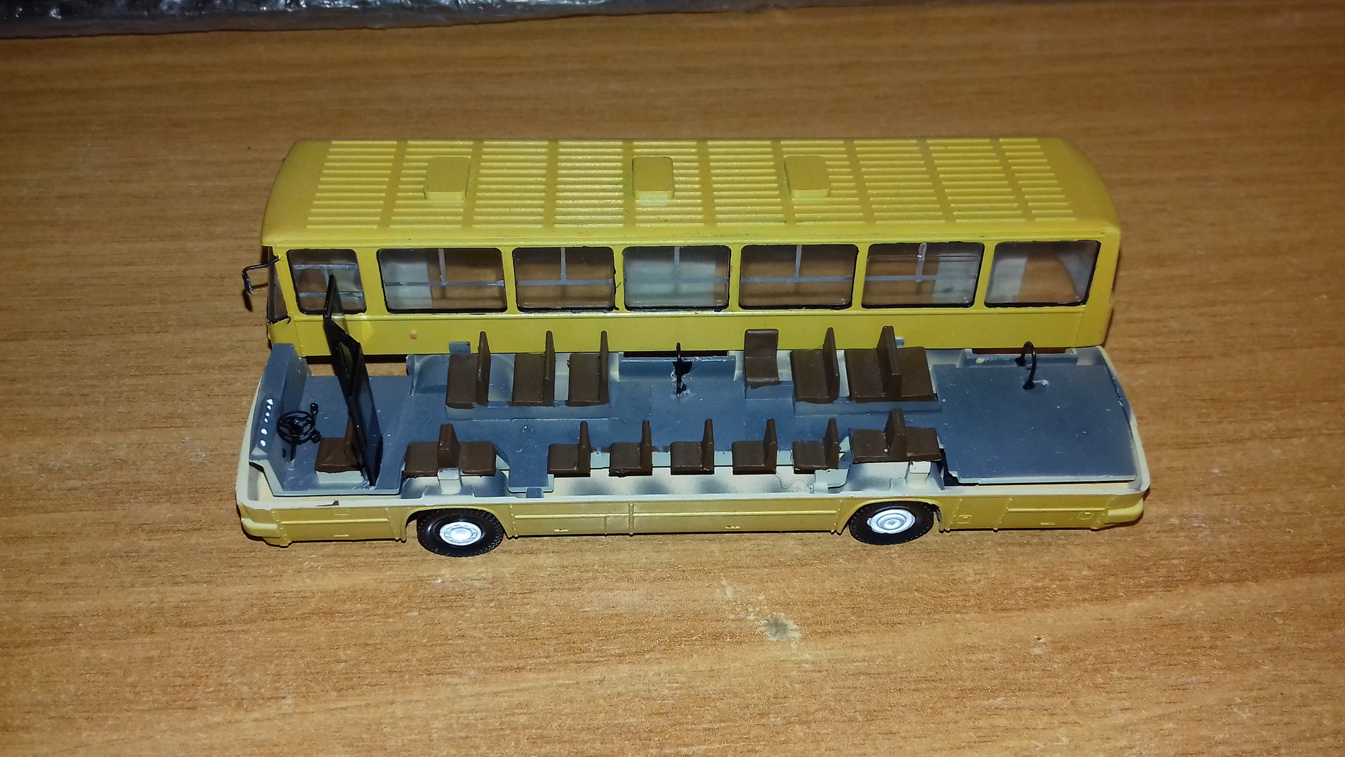 Небольшое "перетрахивание" модельтековского 260-го икаруса - руль, ручка кпп, зеркала заднего вида, потолок из тонкого пластика, покраска. Пока на стадии грунтовки. Красить буду в стандартную для городских икарусов охру.