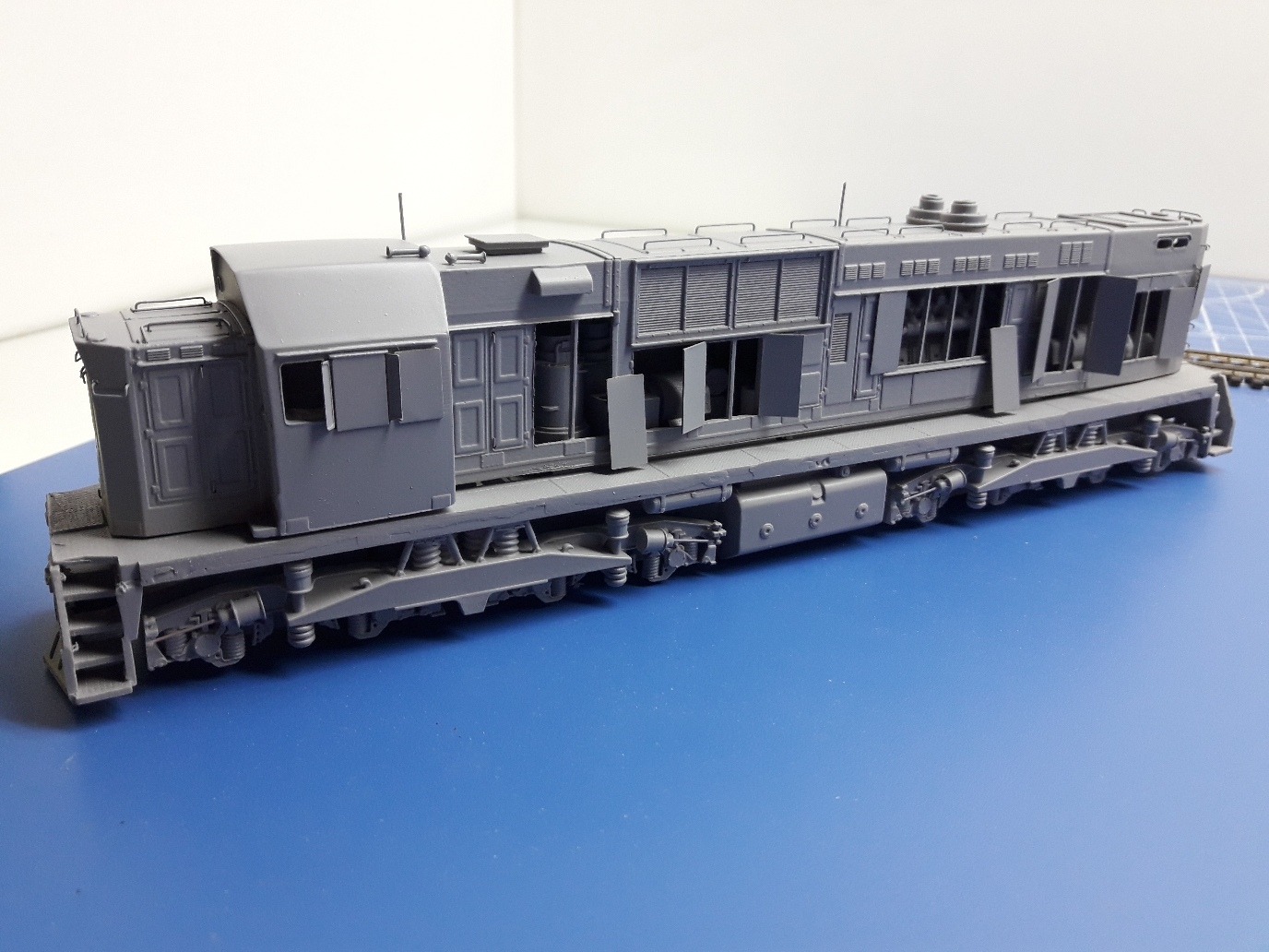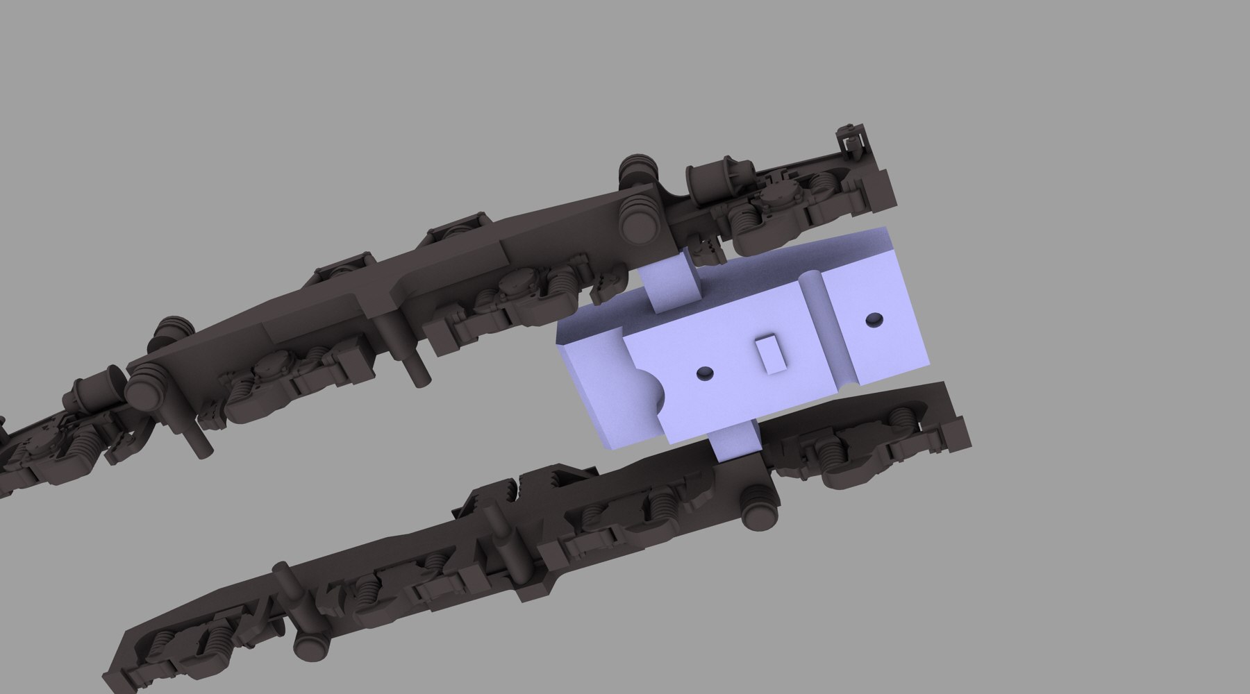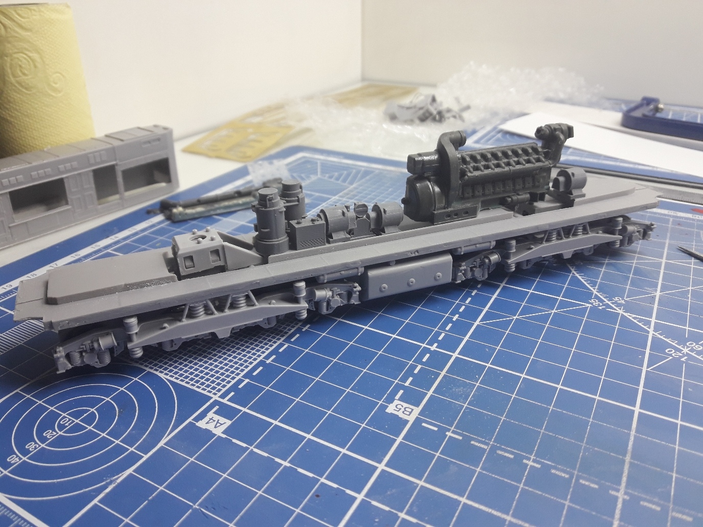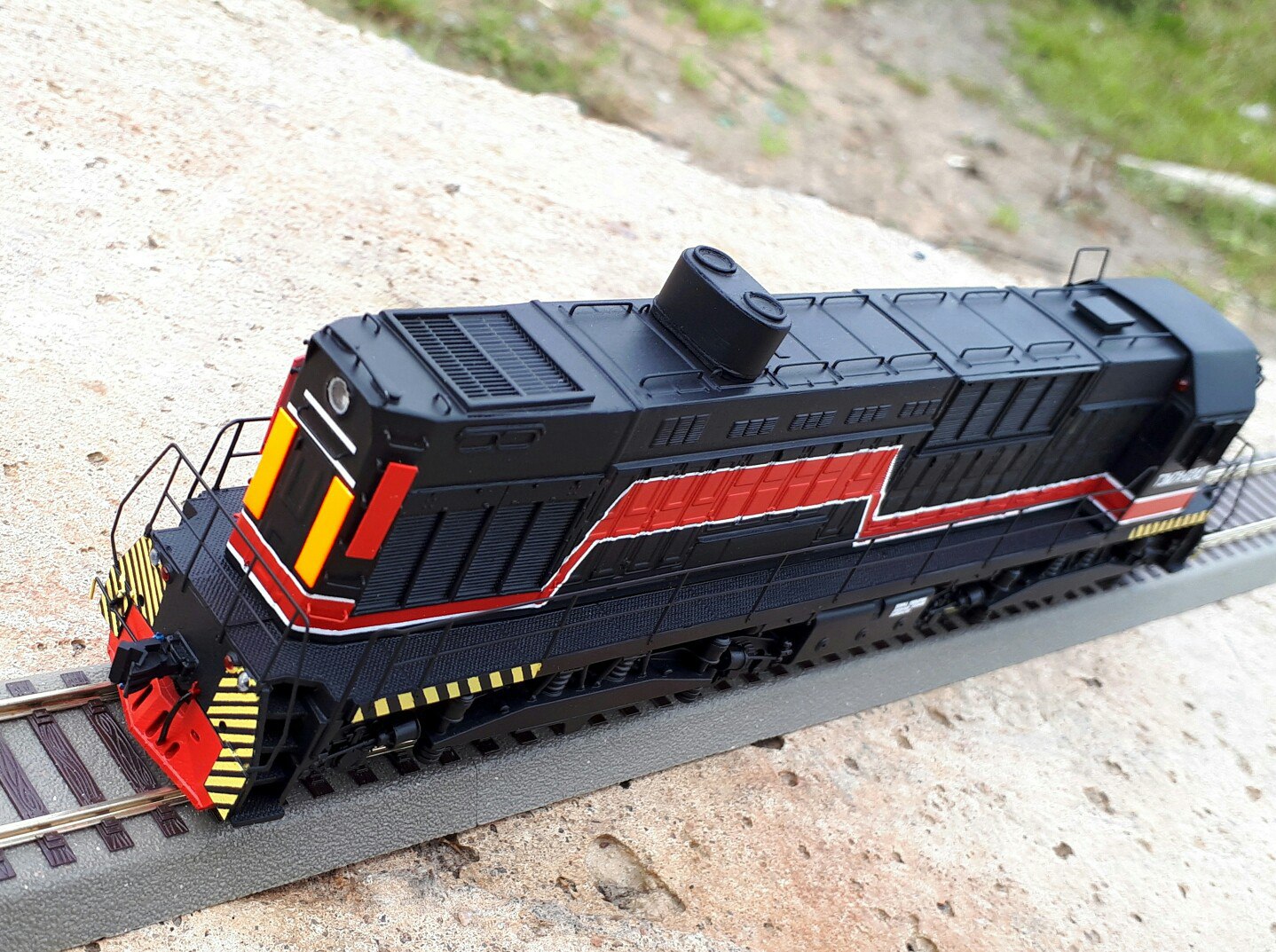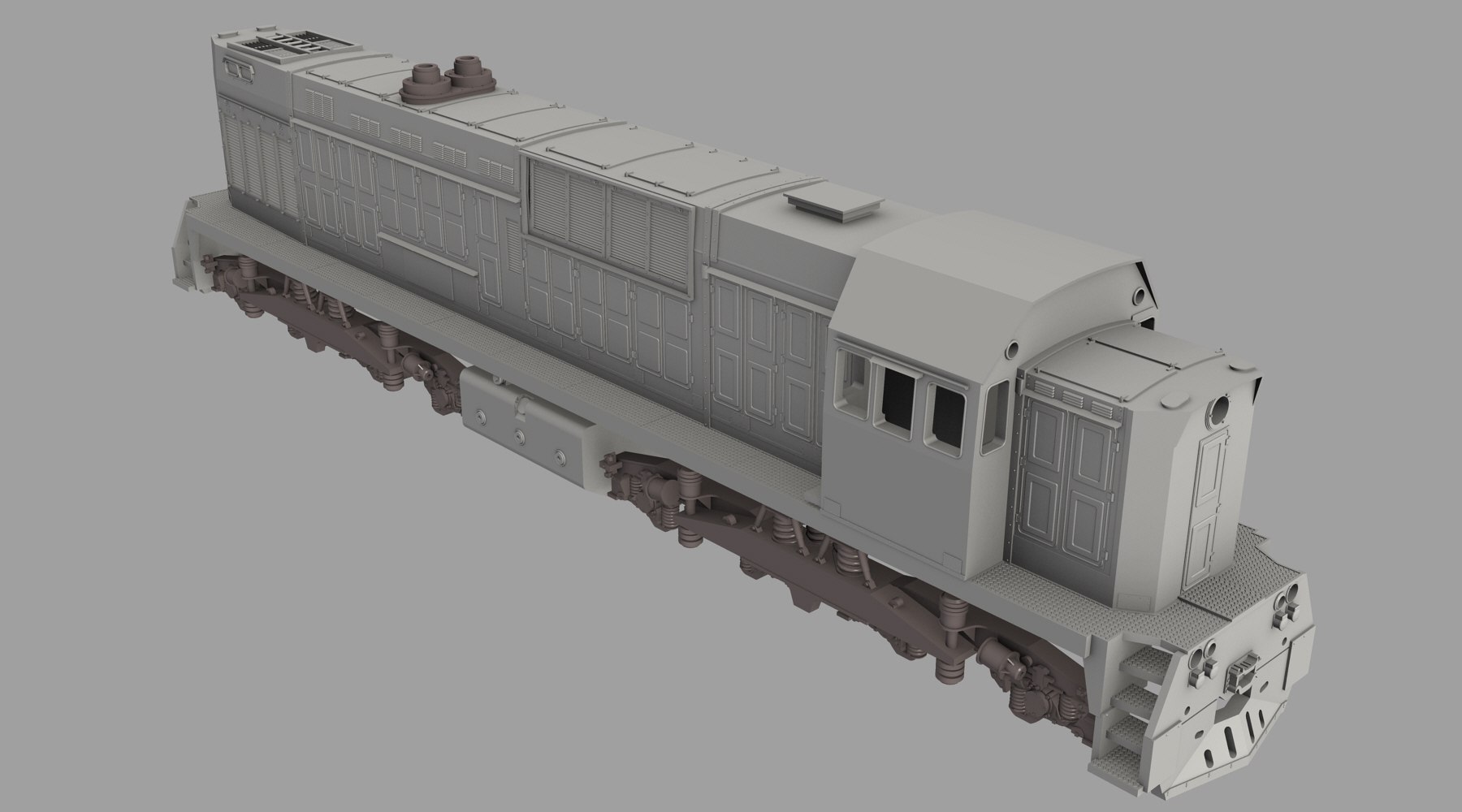 Рендеры модели выкладываю. Мастер-модель выращивается на 3D принтере, дальше тиражирование путем литья из смолы. В качестве ходовой можно использовать модель тепловоза М62 (и любые вариации) от фирмы Roco. Рама заточена под установку мотора а стендовые телеги выполнены в точной копии редукторов Roco+добавлена часть редуктора под бегунковую (не приводную) ось в каждой тележке. Всего привод будет осуществляться на 6 соей из 8.